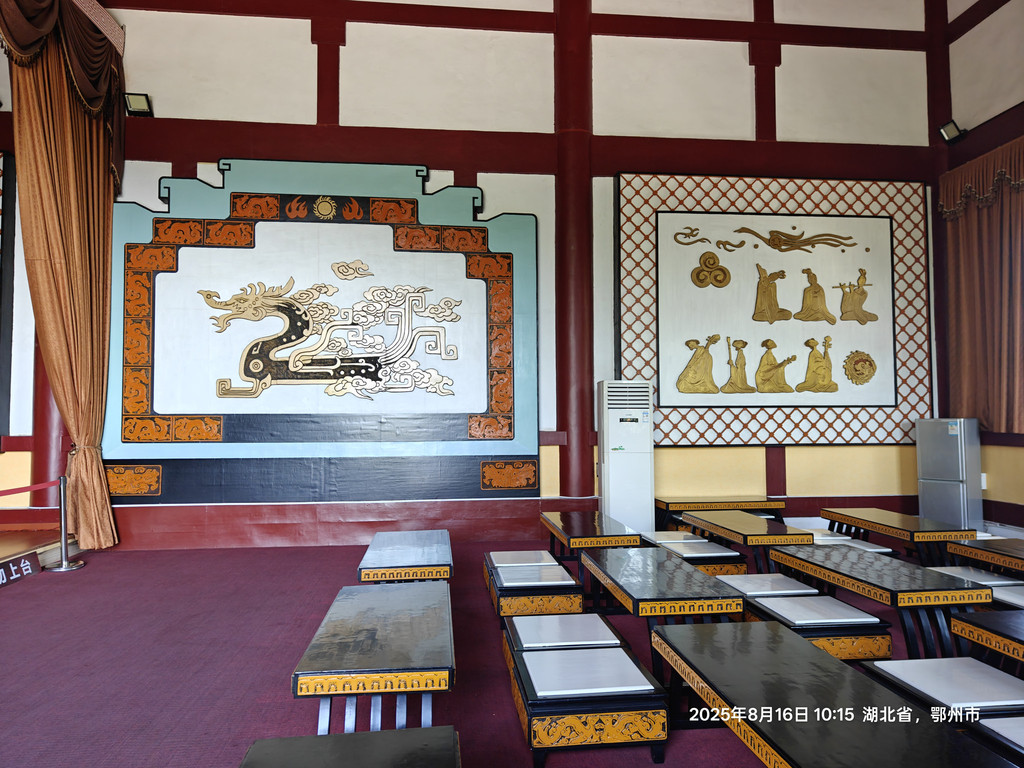 进去一看,不禁哑然失笑,宽敞的一座避暑宫,摆放了一排排类似茶几的长形小桌,后面有小凳。宫殿的左手边是一座舞台,上头搁了一架编钟。原来是喝茶演出的地方,要另外购票。唯一与避暑有所影射的是宫里放了一台空调柜机。在我看来,既然是皇帝的避暑宫,至少要有一张胡床,让吴王舒舒服服地倚靠在那里,有宫女给伺候着,哪有这么挺直了腰板,像听老师上课似的坐在那里避暑的呢,真有点牵强附会了。