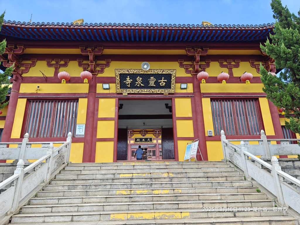 从秀园出来,一路问询,终于有人给我指明了古灵泉寺的方向。顺着阶梯往下走,古灵泉寺的飞檐突然出现在绿树丛中。这座东晋高僧慧远创建的千年古刹,在青龙、白虎二峰之间静卧了1600余年。山门"积翠门"的匾额被岁月染成深褐色,门前的菩萨泉却依然清澈如初。