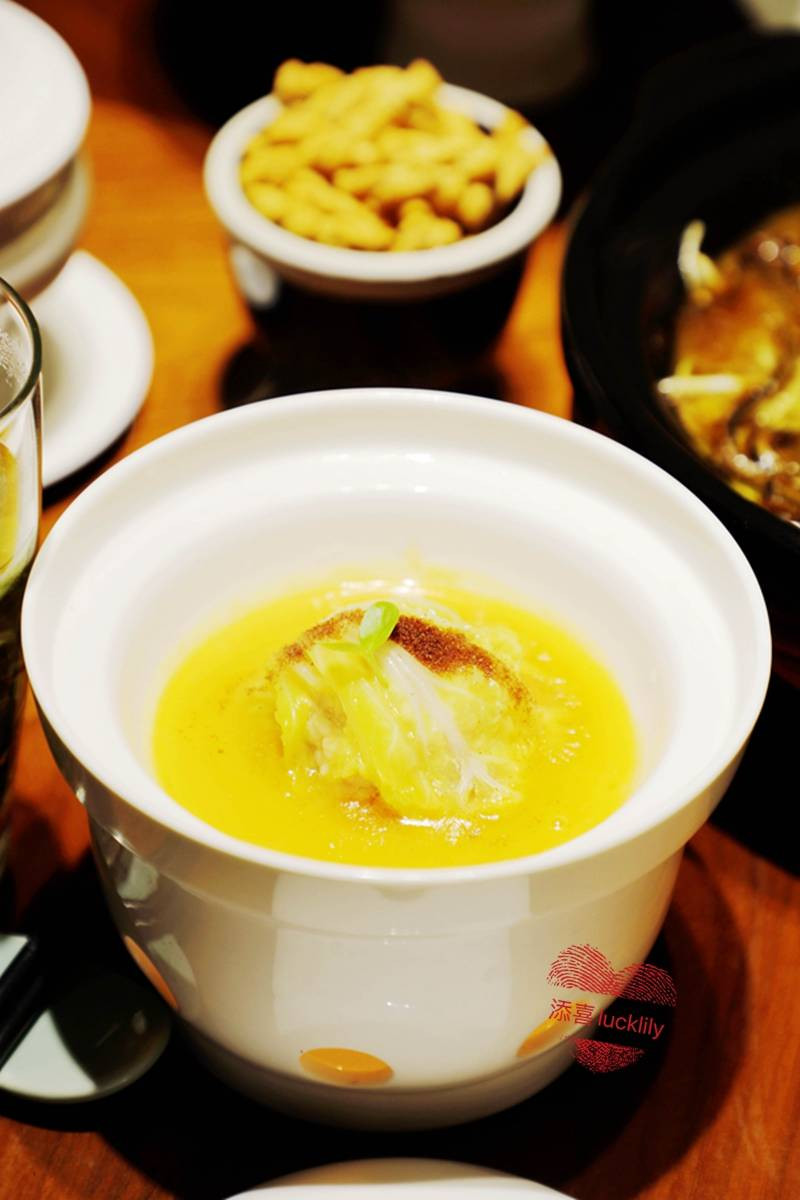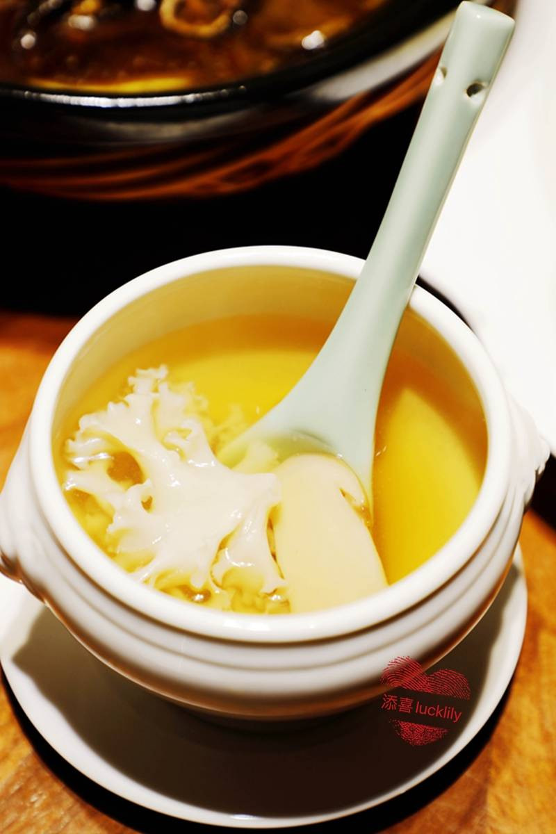 按位上的珍菌汤、苏式三虾狮子头,前者汤色澈亮却清鲜无比,后者做工繁复,料理精致。