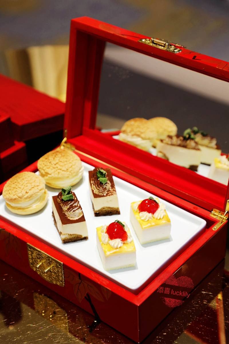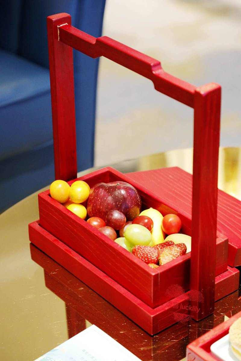 客厅的茶几上还为客人准备了欢迎果盘和甜品,复古的中国红提篮,首饰盒装着,令人喜欢得舍不得吃~