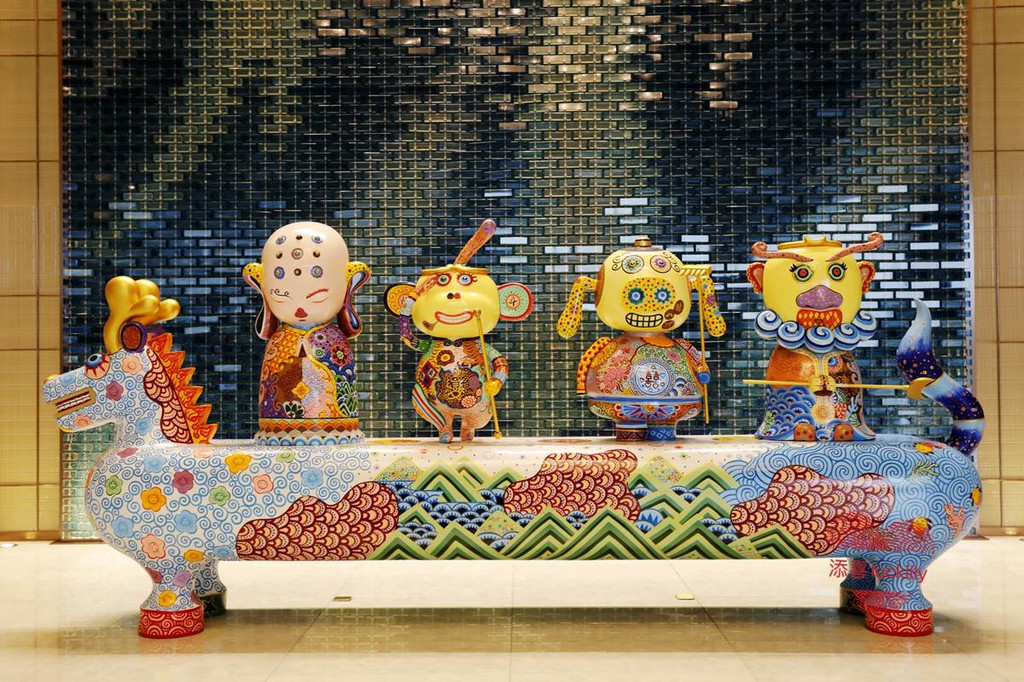 酒店的大厅气势恢宏,设计感十足,装饰元素也别具特色,将传统民俗特色融入在了现代艺术的美绘当中,俏皮又洋气。