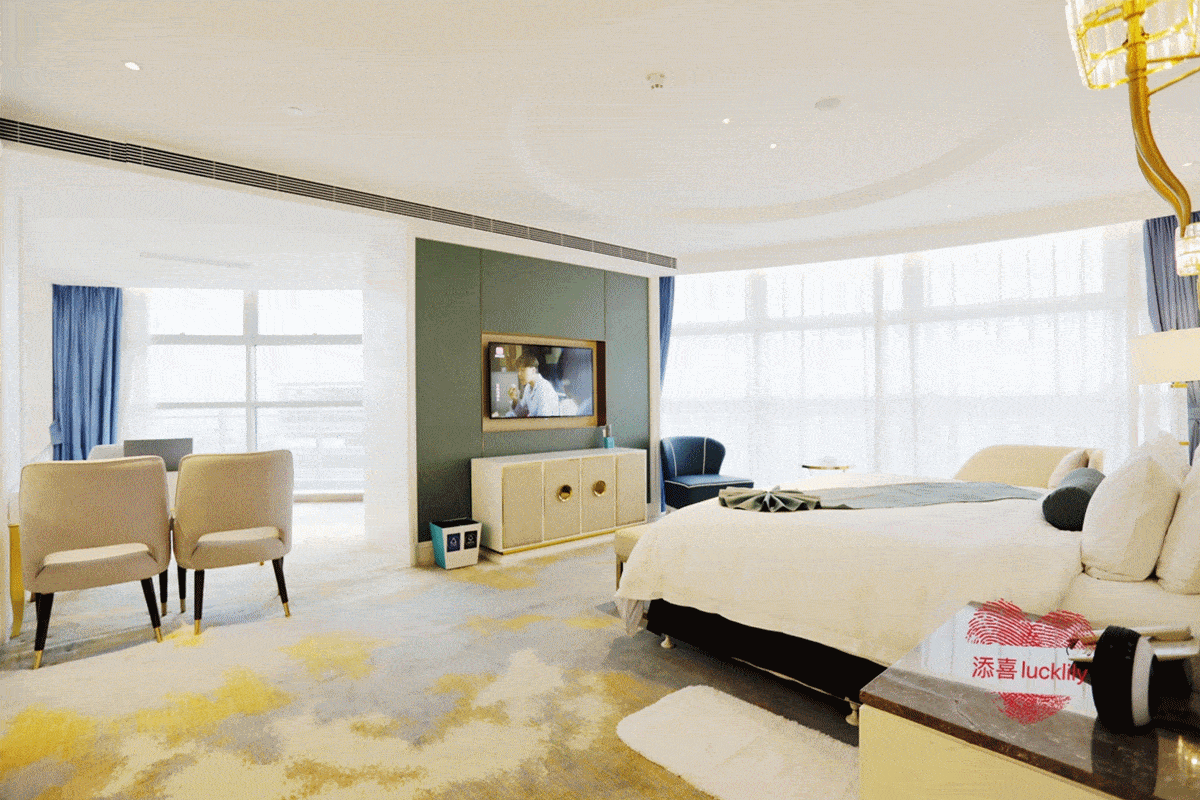 办理完入住,帅气的迎宾小哥哥亲自提着行李箱送我到房间,预订的豪华套房,推开门实在令我有些感叹,太惊喜了,同等价位,在芜湖苏宁环球大酒店奢在了面积,94.5平方的套房,空间感十足,酒店223间宽敞舒适的客房均配备美国King Koil舒适睡床,房间内IPTV可以帮助客人更加顺畅的点餐及购买周边景点门票。而且套房内有为女性打造的独立化妆间、衣帽间,更是让旅行生活也充满了仪式感。