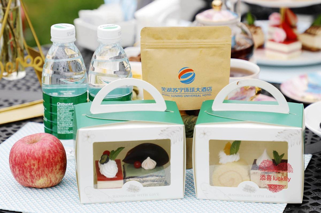 难得来一趟芜湖,想去景点走走,却又十分舍不得这么美好的下午茶,没关系,酒店贴心地将你的心思打包了,乐吧为客人专门准备了外带甜品篮,里面包括提拉米苏、抹茶歌剧蛋糕、香芒瑞士卷、草莓慕斯、三色曲奇包、水果和瓶装水。