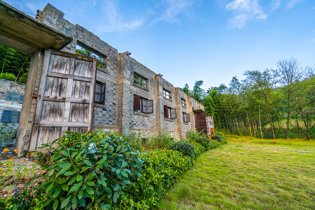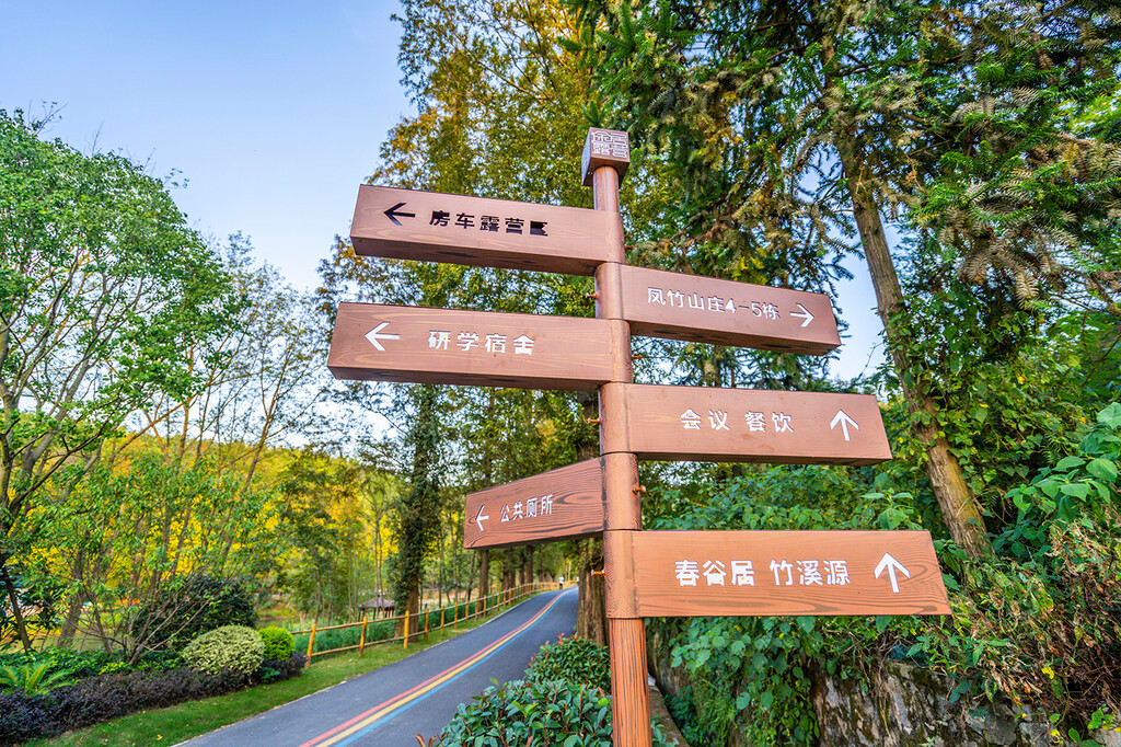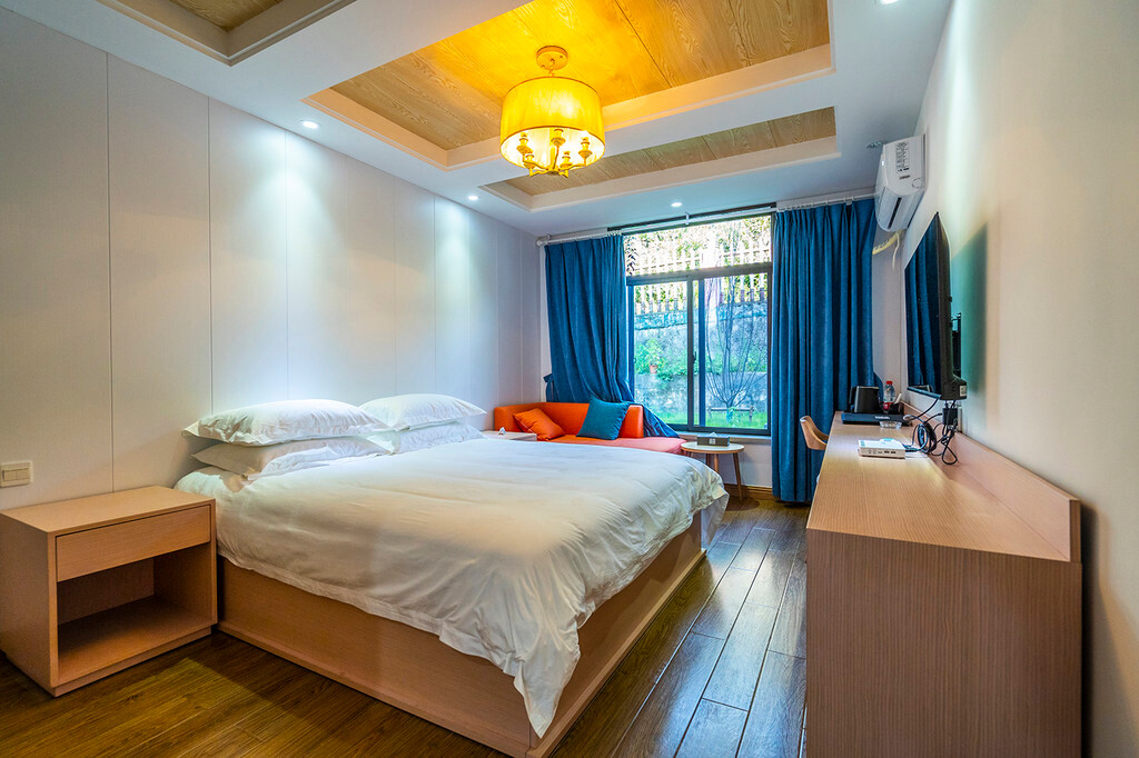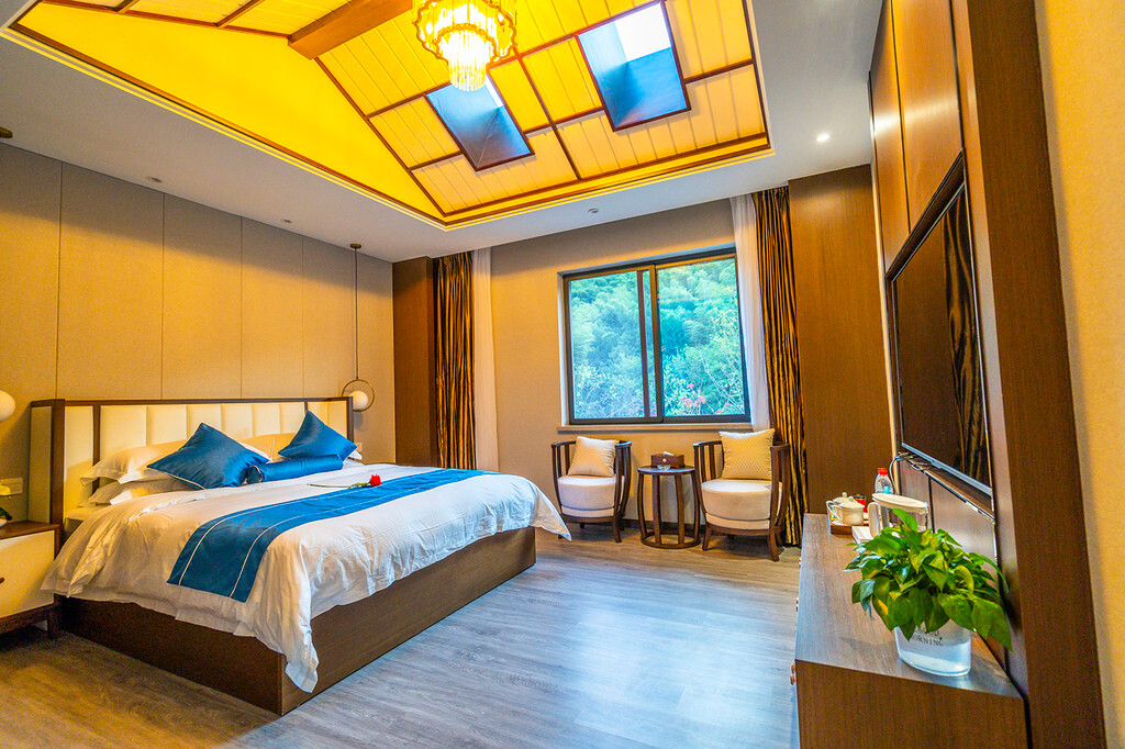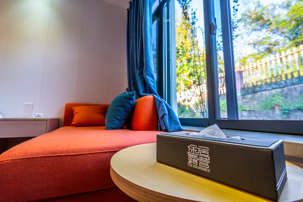 如果有小伙伴只是单纯的想体验户外烧烤和草坪露营的话,那也可以选择入住这里的特色民宿。位于游客中心旁的「凤竹山庄」妥妥的高性价比,民宿内有舒适大床与标间两种房型,撞色的家居设计简约又不失格调,大大的落地窗,将窗外的竹海美景通通揽入美梦之中。