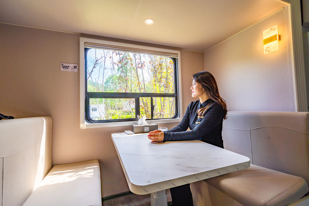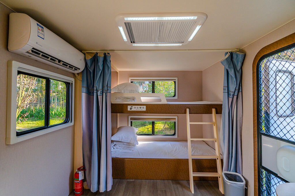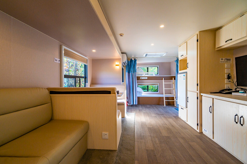9米长的豪华房车打开门就惊到我了,完全不输酒店的室内设计和空间布局,两处空调吹着舒服的让我走进来就不想出去了,沙发也是可升降设计,有一种随时出发的感觉。最喜欢房车里的上下铺,仿佛回到了大学的美好时光,电视、小冰箱、洗漱用品一应俱全,第一印象就是特别温馨。