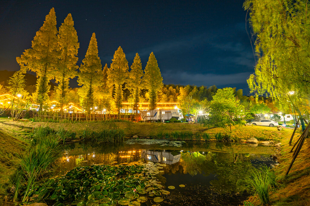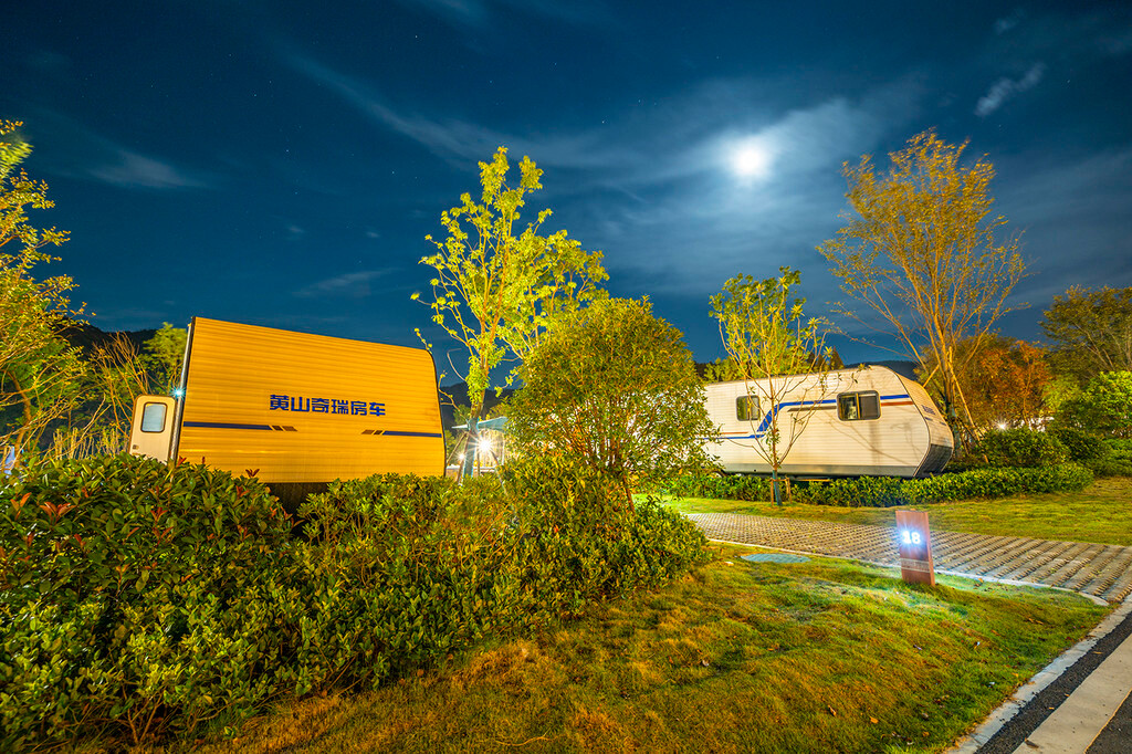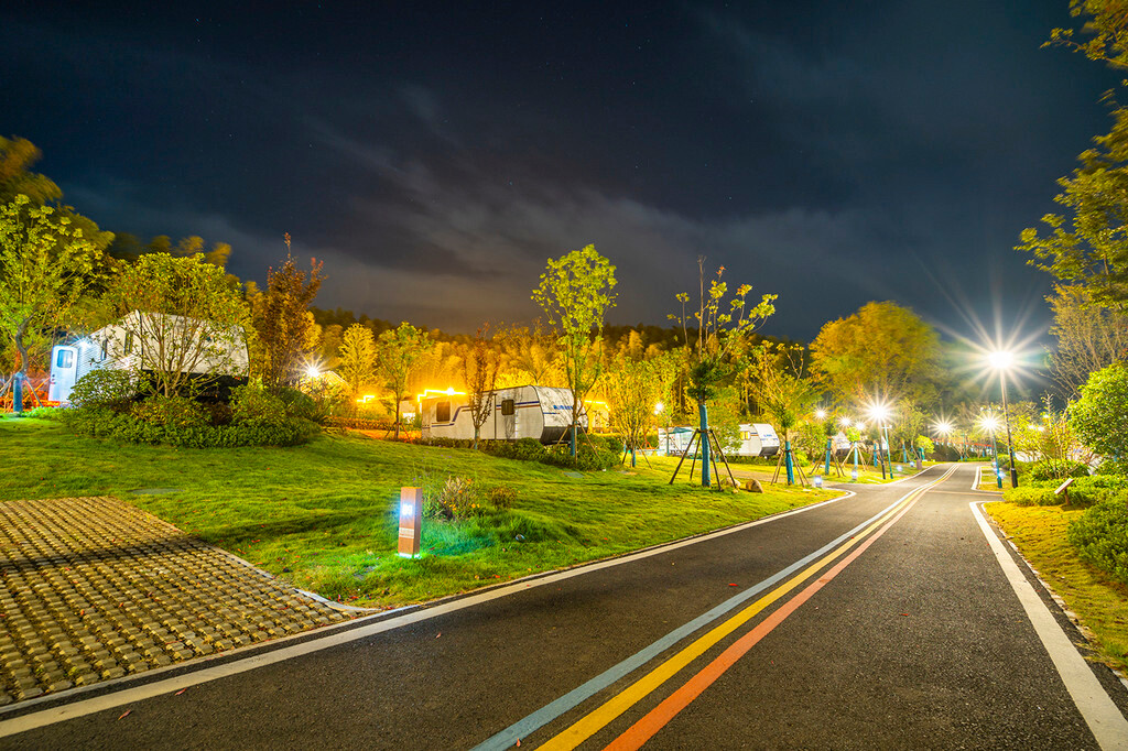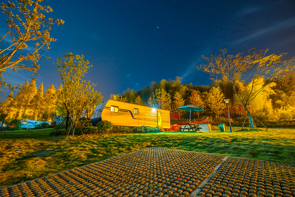 慢慢地走回房车,深蓝的夜空下,一辆辆房车让人感觉身在远方,其实很多时候眼前的风景也并不重要,重要的是那个陪你一起看风景的人。就这样和相爱的人手挽手漫步在水杉树下,听着风吹竹叶的声音,沐浴着纯净的月光,一起向往着美好的未来。