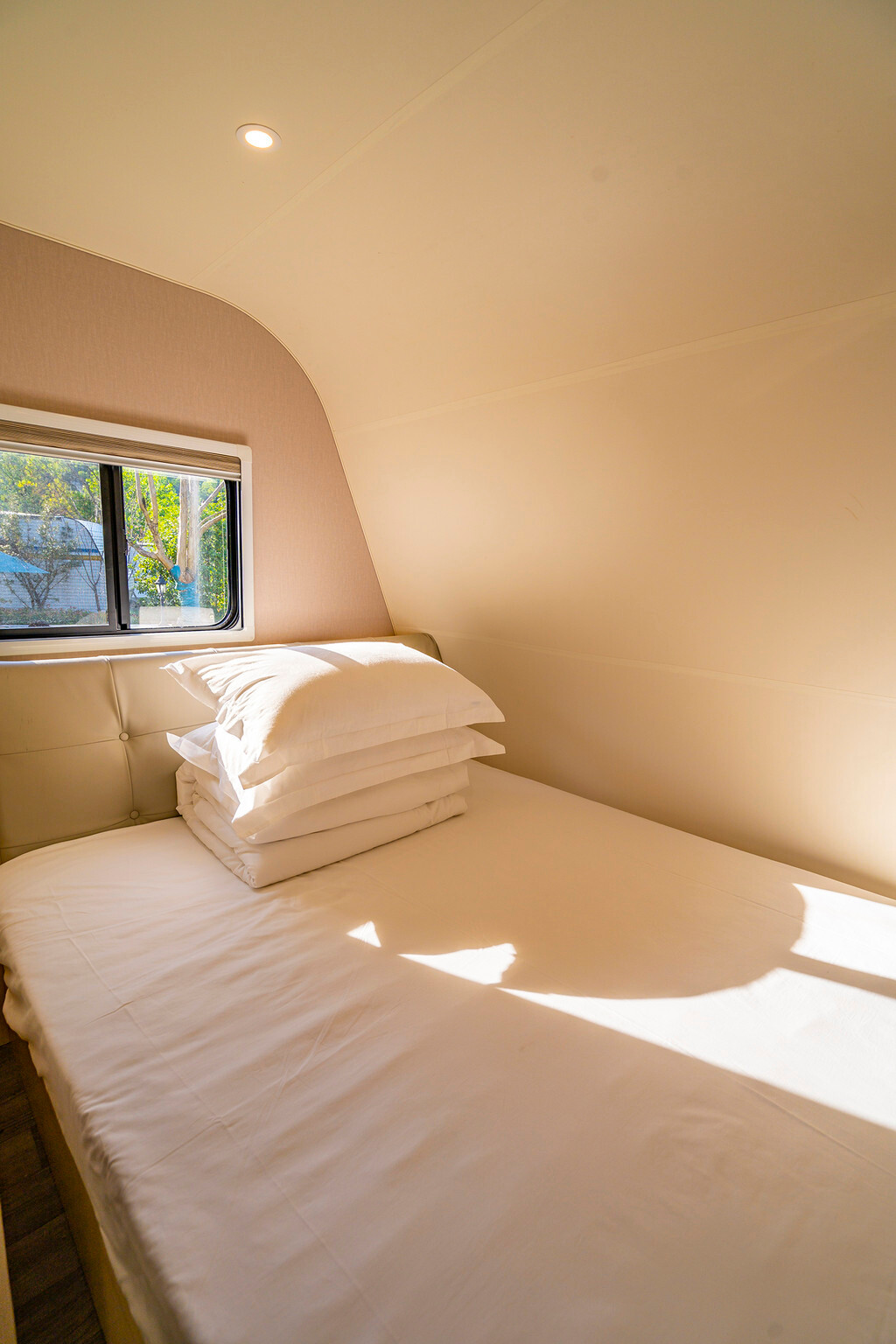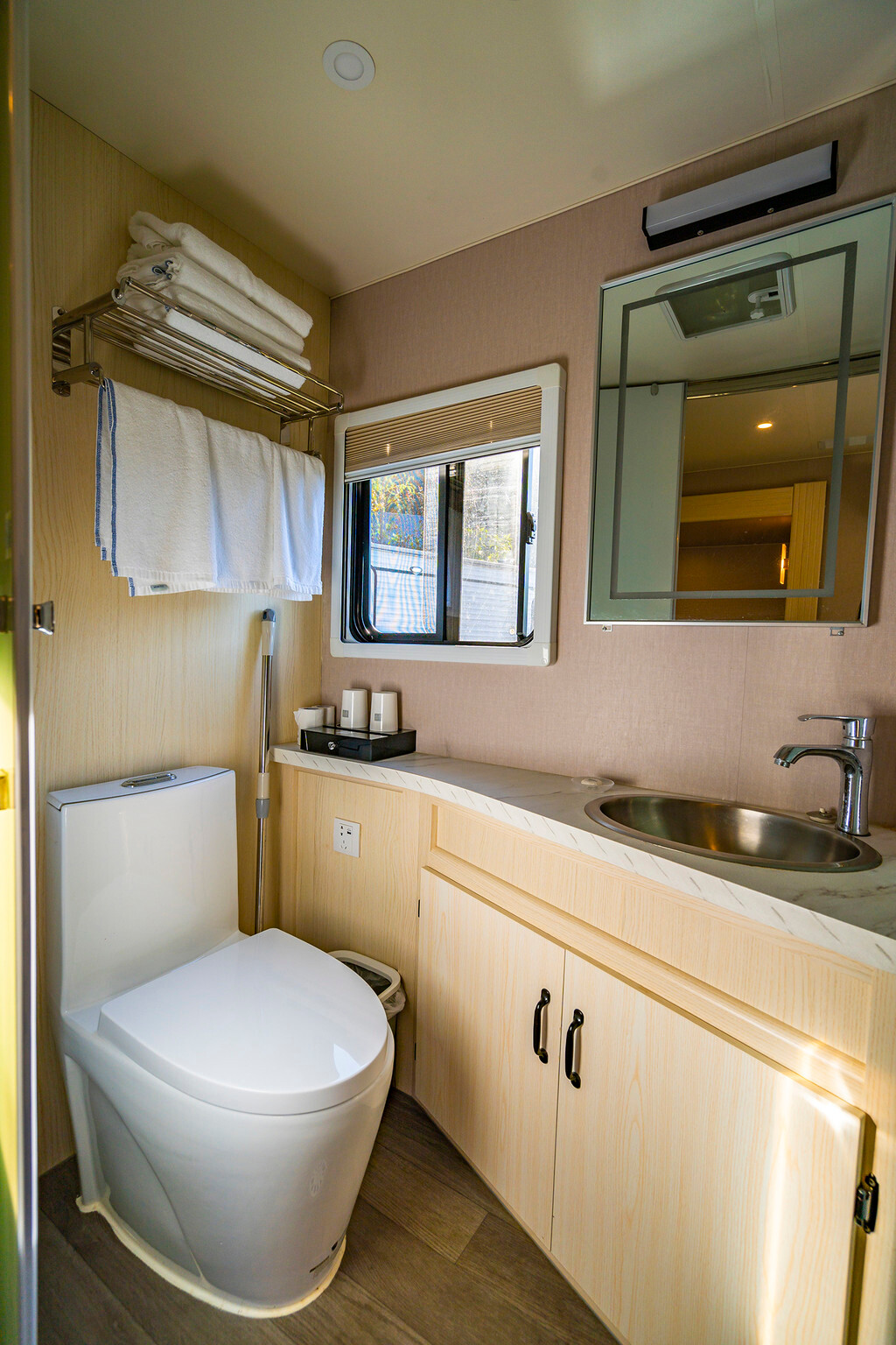 小小的房车内大有乾坤,卫生间的设计也是精巧合理,充分的利用了房车的每一处空间。还有最里面的双人大床,午后的阳光正温柔的照在洁白的床单上,真的太惬意了。