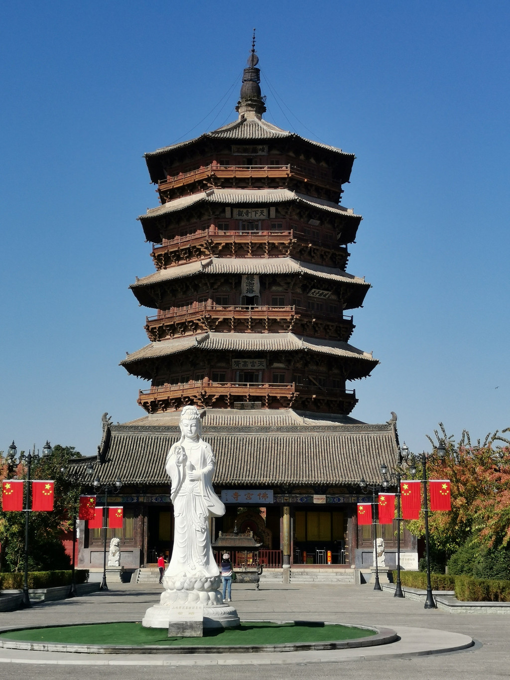 下午我们驱车去应县看木塔,应县木塔距离大同古城80公里,经过二广高速和省道需要1个多小时就到了,应县因为有木塔已经发展得跟之前完全变样了,十几年前得土路和沿街的小平房现在都变成笔直宽阔的柏油路和几层的楼房,只有木塔还依旧可以远远地看到,好像告诉世人应县这上千年还是依靠我木塔,没有什么可以超越我木塔。外沿八边形的应县木塔没有使用一颗铁钉,全靠木头之间的榫卯连接,历经风雨、地震和战火屹立不倒,成为国内现存最高最老的纯木木塔,现在为了保护木塔,里面不让上了。