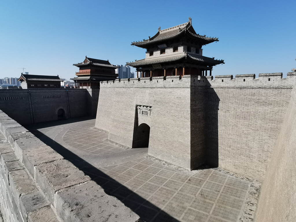 第四天我们计划先去大同城墙转转,再去应县木塔和悬空寺。出发不远就是十一刚开放的大同古城墙,扫了健康码免费登上城墙。之前来过几次大同游玩都没有登过城墙,今年是新开放的,站在城墙上可以全景欣赏大同古城的全貌,可以看到不大的古城里那些著名景点古色古香的屋顶,城墙很宽,可以在上面租自行车游览,我们更喜欢在上面慢慢走着晒着太阳欣赏古城景观,从东门上城墙到南门下城墙我们游玩了近一个小时,孩子非要骑三人自行车,爬过苏木山之后感觉骑车十分费劲,有一大段我是宁可推车走。
