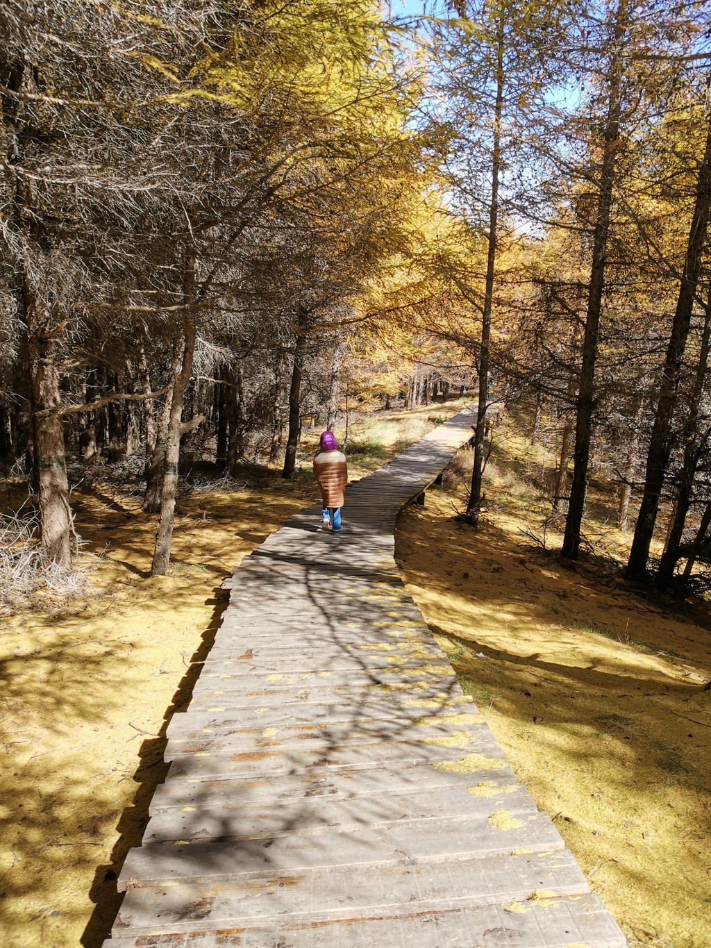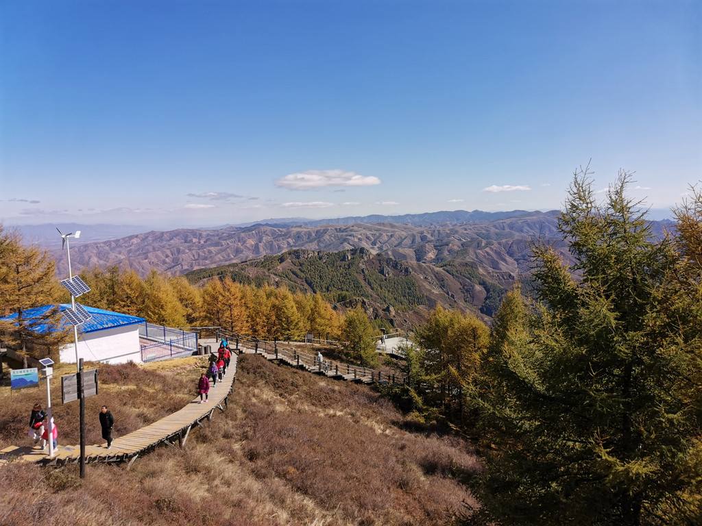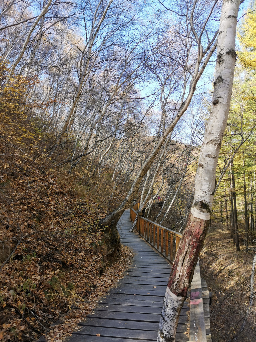 苏木山群山环绕,山势渐高,有景区汽车走的山路还有人工修建的木栈道可供游人步行爬山。我们为了节省体力就买了上山的车票(40元/人),乘坐景区的中巴车沿着比较狭窄的山路上山,也就是景区的司机有经验,两辆车错车都基本不用减速,坐在车里左右摇摆,感觉很刺激。开车上山大约要20多分钟,如果乘车下山要在山顶买票。山顶气温较低,我们把能穿的羽绒服都穿上,戴着帽子,就后悔没带手套了。向上爬不远就是一个比较大的观景台,可以环看周围的群峰,树木葱郁,有部分树叶泛黄,整个山顶地面上铺满了黄色的松针,走在木栈道上都有点打滑。山顶空气清新,蓝蓝的天空,刺目的太阳,不带墨镜看远处都会炫目。在山顶转了一会儿我们就决定走下山,去看看传说中的白桦林。整个下山的路都是木栈道,我们后悔忘拿登山杖了,很久没爬山,走一会小腿就硬了,走到半山腰就开始打晃了。山上的树木以松树为主,半山腰有一片白桦林,明显区别于其它地方的色彩,踩在覆盖着树叶松针的地面十分松软,树干间隙透过的阳光给昏暗的的山间带来些许温暖。下山大概花了1个多小时,主要是不时的停下拍照和休息。快到大门口时已经是12点了,游人都排起长队等候上山的汽车,我们走回停车的地方吃自己带的自嗨锅。景区周围没有饭馆,建议自带干粮去玩。