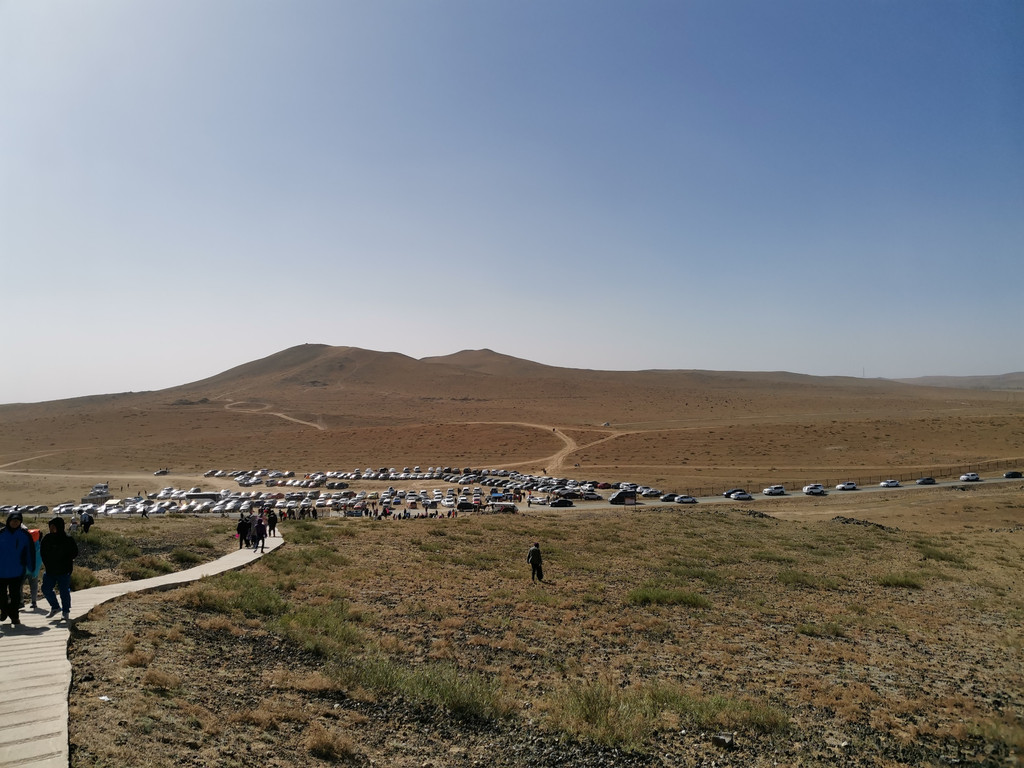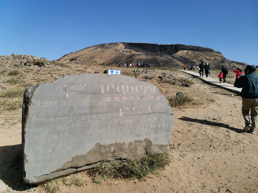 第二天在酒店吃过早餐我们驱车去乌兰哈达火山地质公园,1个半小时就到了。当天刮大风,途中吹得车都微晃,高速路上车很少,沿途可以看到泛黄的草原,有时能看到奶牛和羊群在草地上悠闲地吃草。离目的地还很远就能看到大草原上突起的几个火山口,之前看过日本的富士山、夏威夷的火山和新疆的天山,草原上的火山还是第一次看到。按照导航我们到了火山群,在一个岔路被羊群堵住去路,只好掉头去另一边比较近的火山-北炼丹炉火山渣堆,山下就是停车场,由于风太大,卷起的沙尘打在脸上都有些疼,老婆孩子就在车里不愿出来爬火山口。我觉得好不容易来了怎么也要上山看看,就在车里穿好羽绒服、戴好帽子和墨镜走到火山下,只有几十米的路,人被大风吹的直摇晃。上下火山口有一条刚好并排走两个人的台阶路,火山口不高,但因为风太大,走上去很费力气。大风直往耳朵里灌,我只好双手捂住耳朵挡风,因为没带手套,手被大风吹得发疼。上下火山口还看到几条狗跟着主人爬,看着小狗就像要被大风吹到台阶外面了,主人有的只能抱着小狗前行。火山口离地面也就几十米高,但在如此大风天走走停停,我竟爬了快半个小时,到了火山口一圈周长大约几百米,台阶路终点有一处不大的平地,可以站十几个人,大家背风拍照,身体都在摇晃,估计手机如果没有防抖动的功能就白上来了。火山口里面像锅一样比较光滑,有几条交叉的土路可以供游人走,最底部离火山口感觉就几十米。呼呼的风声充斥了摄像里的声音,呆了不到一刻钟,我就赶快下山了。下山路上可以看到火山渣散落在路边,蜂窝状黑黑的火山渣与在夏威夷看到的火山渣一模一样。有人捡拾火山渣留作纪念带回家,由于在夏威夷听过一个关于火山渣的故事,我就没带回来任何火山渣做纪念。