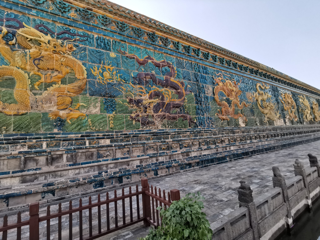 寺里面人不多,可以感受闹市中的一抹宁静,寺内雕塑、壁画和建筑都十分精美,是个必去的打卡点。出善化寺向北走过一条街就进入步行街,两边都是商店,几百米后就到华严寺,因为孩子对寺庙不太感兴趣,我们就一路向东走到九龙壁,大同九龙壁跟北京北海九龙壁和故宫九龙壁并称中国著名的三大九龙壁,北京的两个九龙壁都是建于清朝,而大同九龙壁则建于明朝,直观看三个九龙壁都仿佛是一样的,可能更突出的是北海的九龙壁,因为是前后两面都有九条龙,比其它两个地方的单面九龙壁更精美。