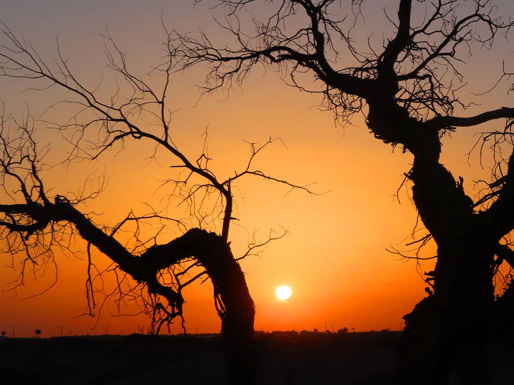早餐后乘车赴额济纳,中餐后前往探寻古丝绸之路上保存最为完整的西夏古城遗址【黑水城、怪树林】,孤独、寂寞、不甘的倾诉,传说每年春风袭过之后沙漠迁移,走进古城中不时能捡到各种西夏时期的瓦片和发白的牛骨,在不久的将来也许会彻底的消失在历史的长河中。夕阳西下之际顺便观赏日月同辉的奇特景色,感受蔚蓝碧空之下金色荒漠戈壁悠悠。傍晚乘车返回小镇,入住酒店。