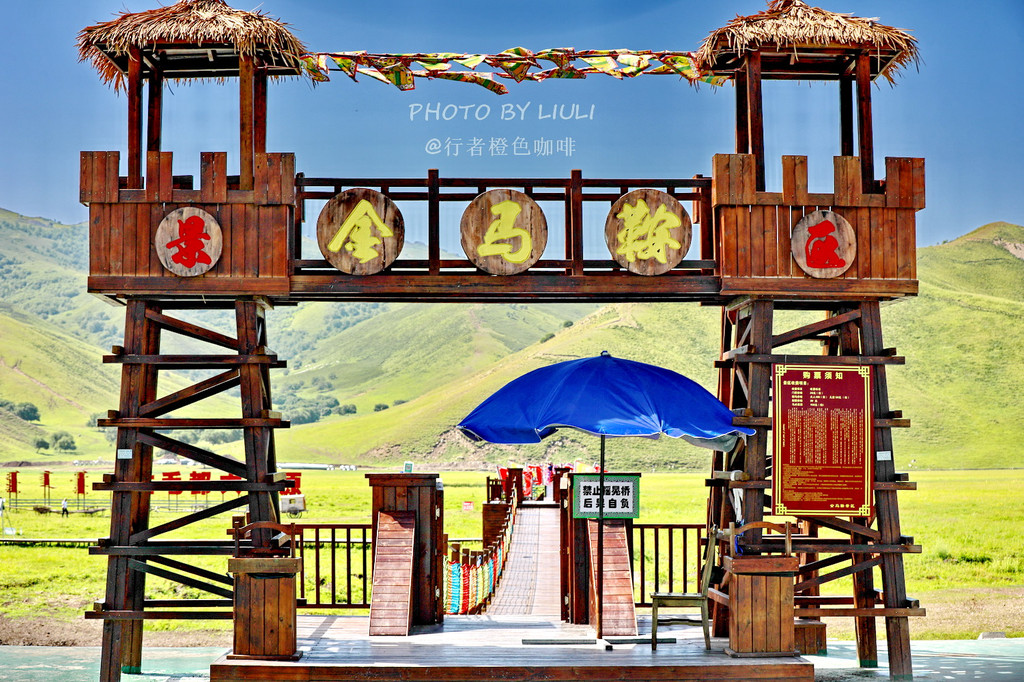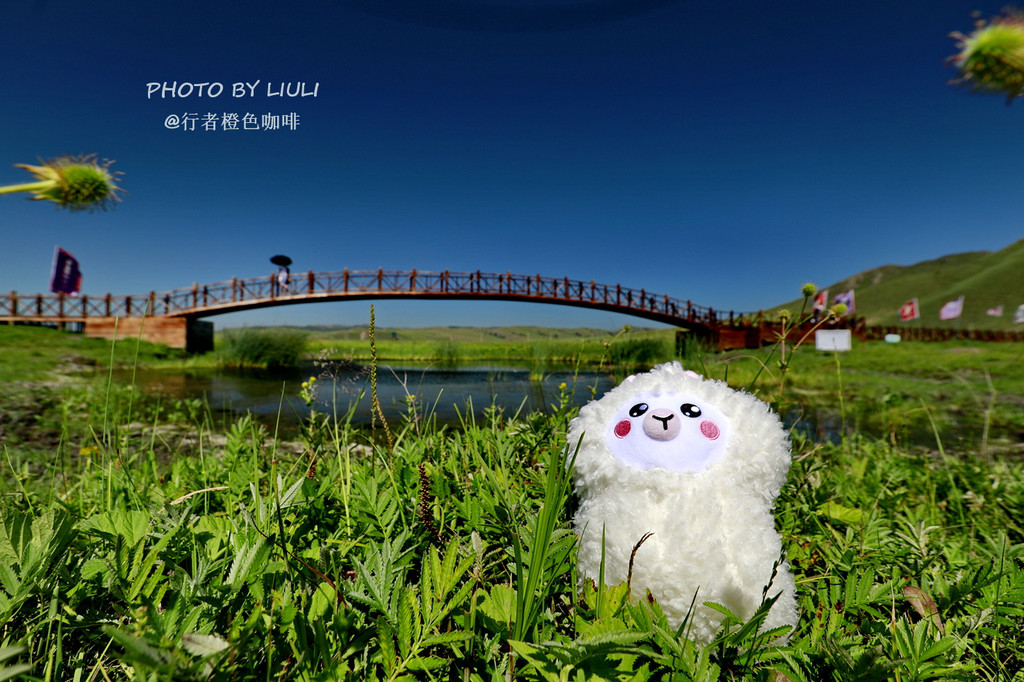 踏上大门内摇摆不定的网红彩虹桥,先体验一番惊险刺激的乐趣,沿着生态木栈道可以走到草原腹地,又一条拱桥跨河而过,我们的小羊驼在草地上仰望水天一色。