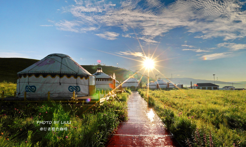 清晨五点,阳光早已迫不及待洒满草原,蓝天白云争相登场,沿着度假村后面山坡上的木栈道,就可轻松登临山顶盼归游子的妈妈敖包。