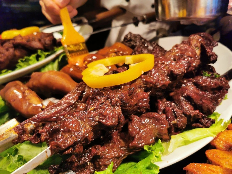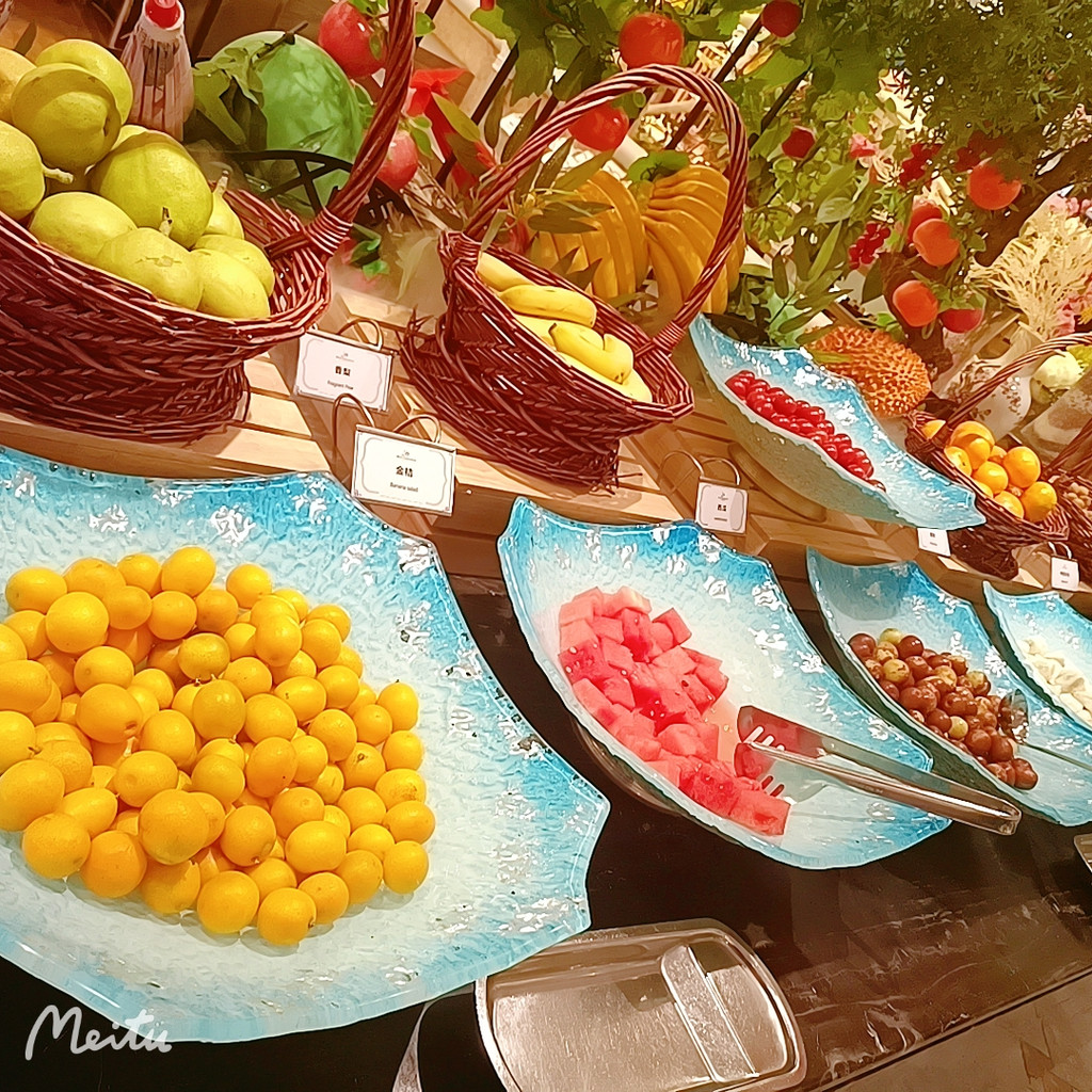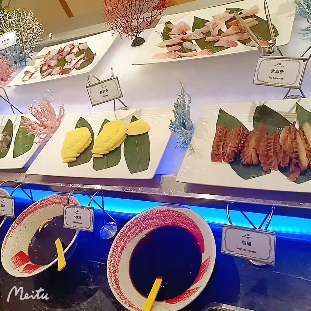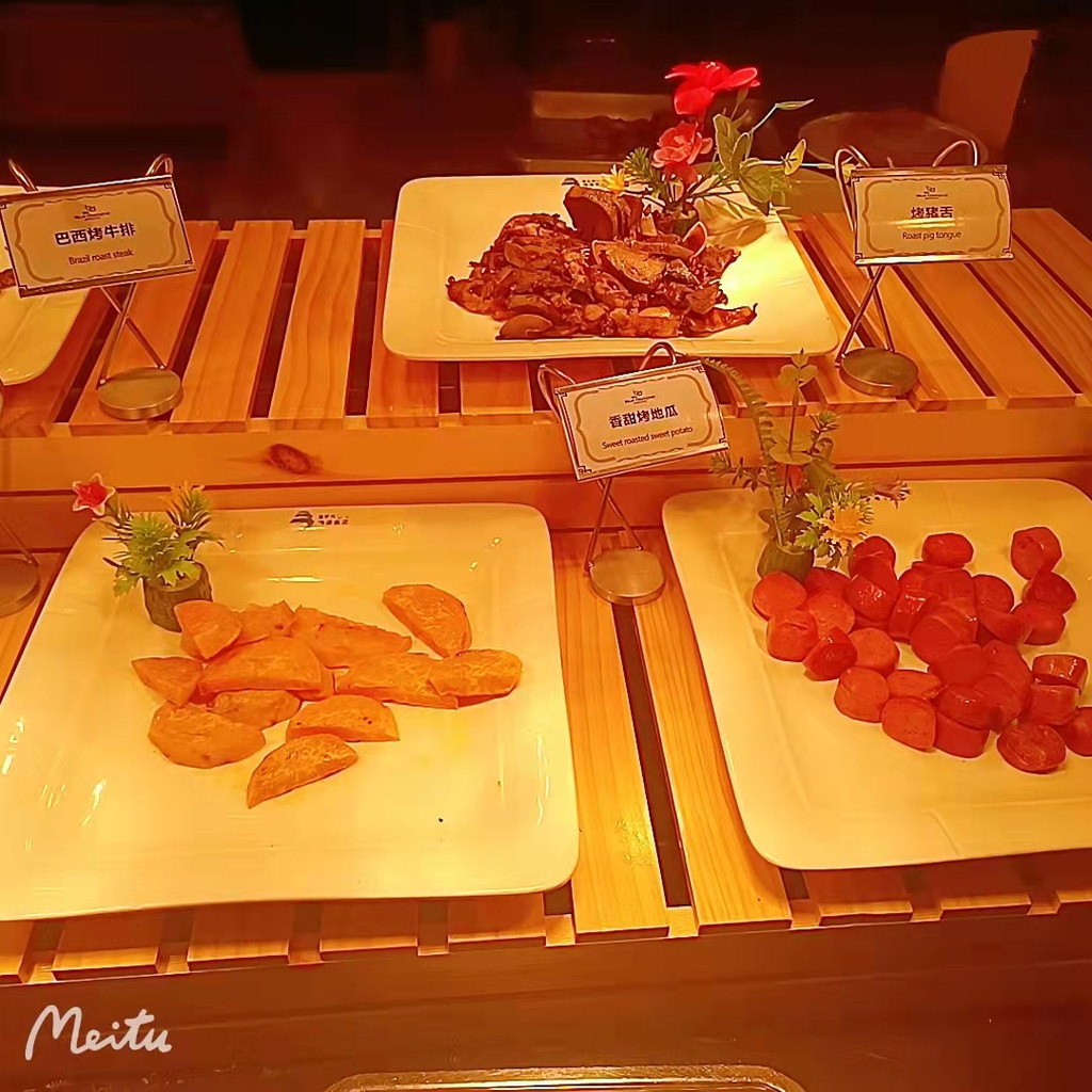 晚上在酒店吃了一顿自助餐,服务人员特别热情,知道我是第一次来,还主动给我介绍了酒店的特色菜品,菜品很多,烤鸭,寿司,海鲜应有尽有,特别喜欢的就是巴西烤肉,还有一款酸奶,特备好喝,其他的也都很喜欢吃,吃的很满足,烤鸭都是厨师现场包好的装盘子里。