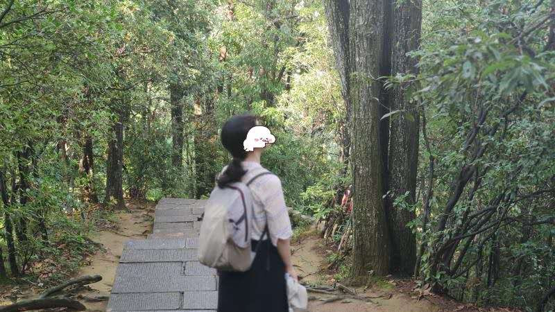事实证明。。。是真的o(╥﹏╥)o。。。这边的猴子真的好主动,眼神那叫一个专注和机警。我们上山之后本想绕着山顶大环寨走一圈,由于人少,一开始我和我先生两个人,在林间小路上慢悠悠地走着,到了各个观景台就停下看看,温度适宜,景色宜人,心情放松,还是十分愉悦的,直到。。。我们迎面来了一只猴子!!它不让我们过去??!!!