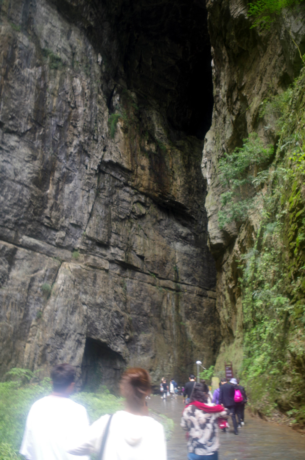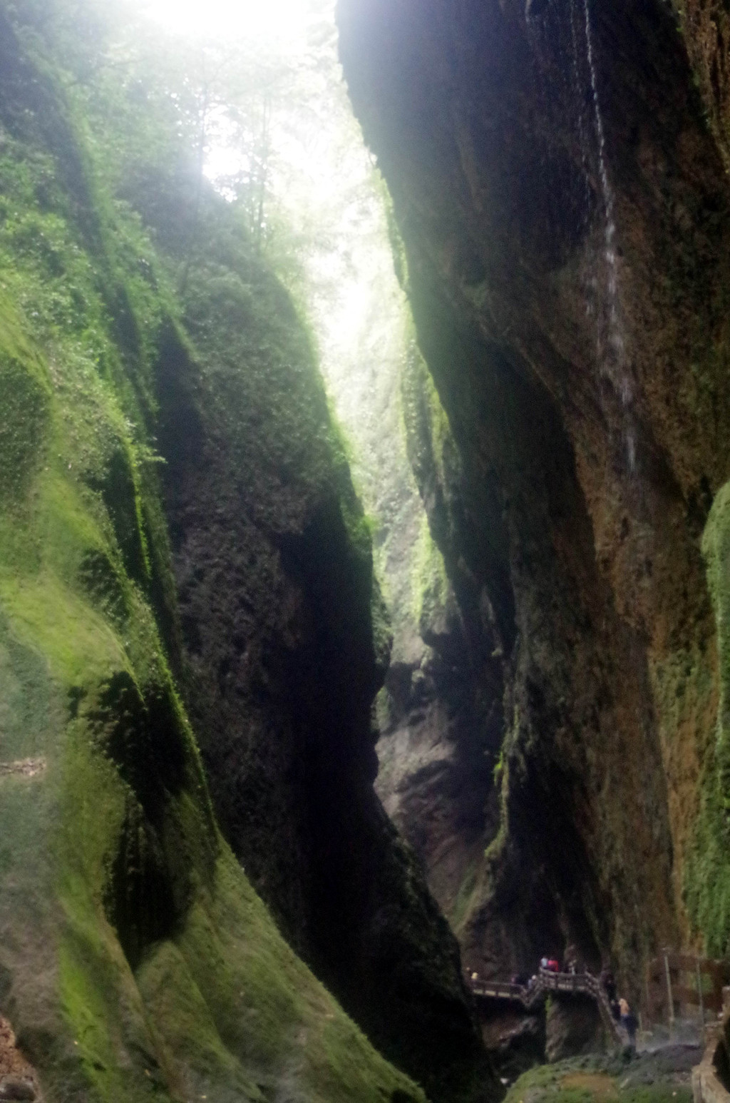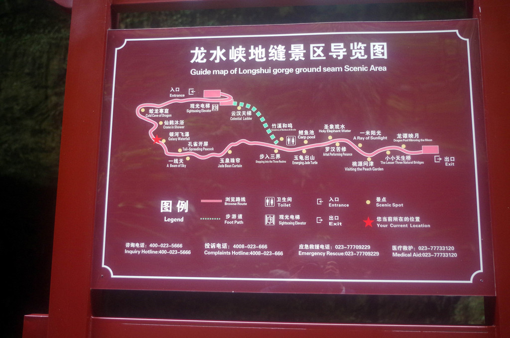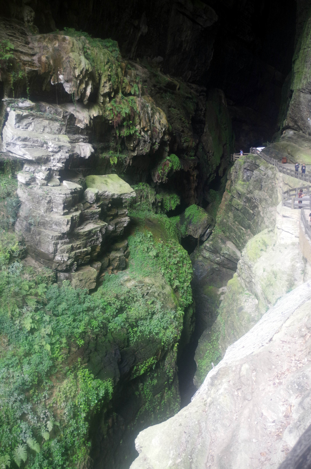 我们是由中部坐一架直升电梯下去到半腰的,然后曲折继续下行直至谷底,通行长度为3.5公里,缝深80到200米,底宽3到30米,缝两壁陡峭如刀切,是典型的“一线天”峡谷景观。
