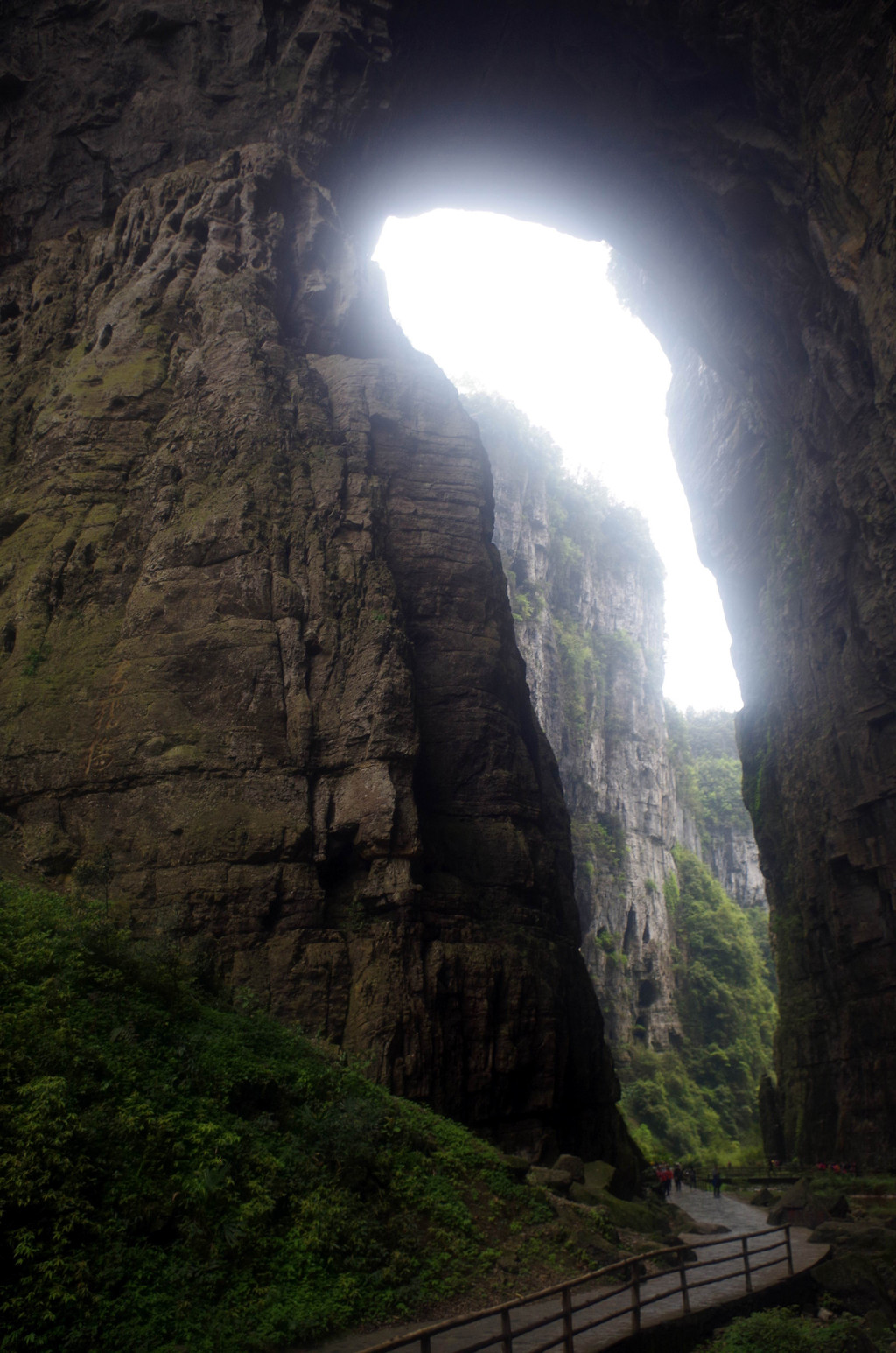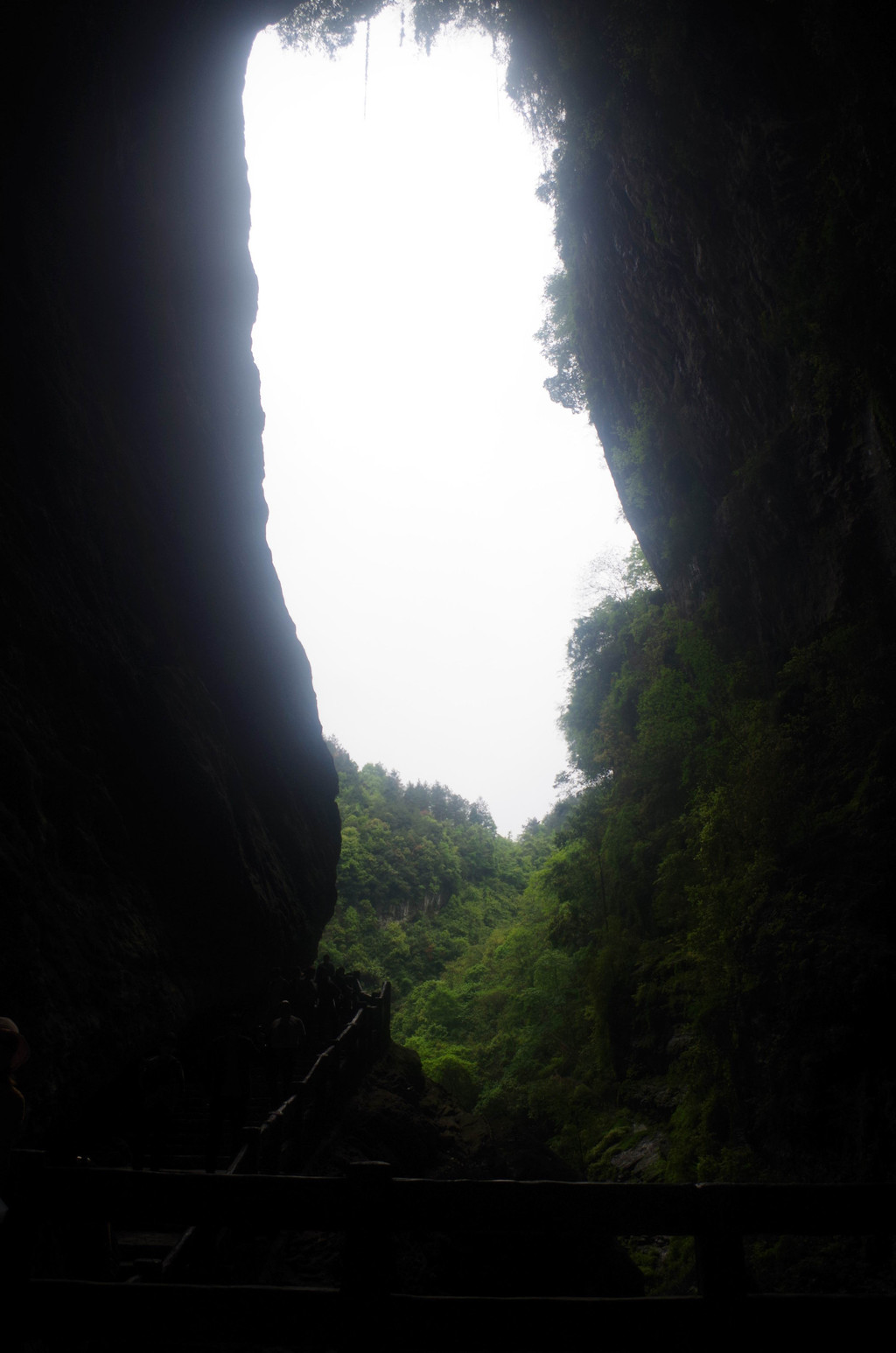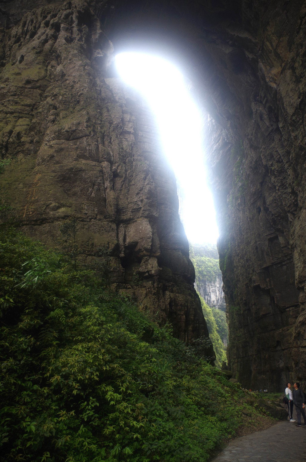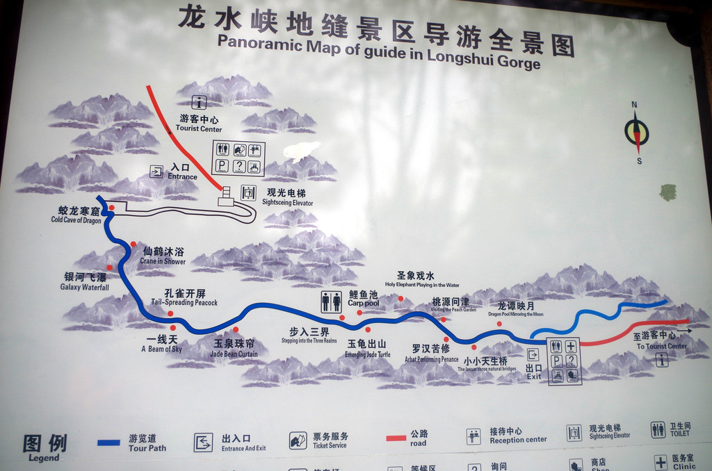 我们是由中部坐一架直升电梯下去到半腰的,然后曲折继续下行直至谷底,通行长度为3.5公里,缝深80到200米,底宽3到30米,缝两壁陡峭如刀切,是典型的“一线天”峡谷景观。