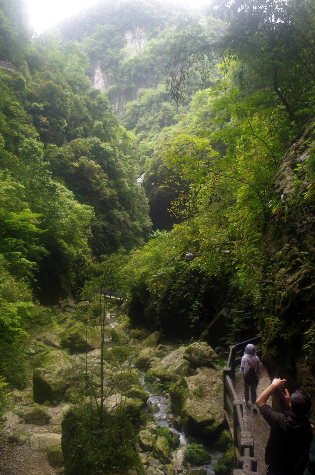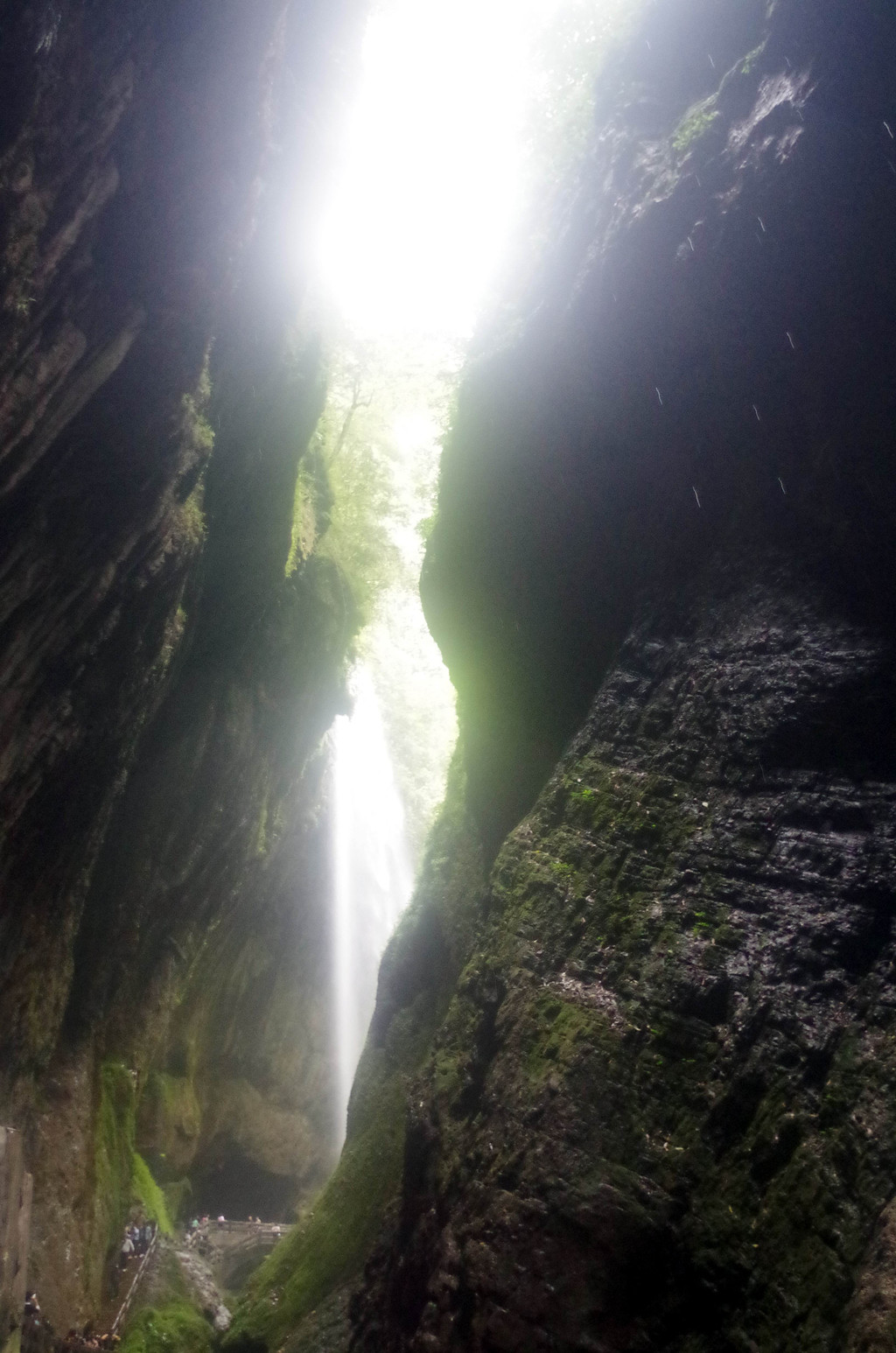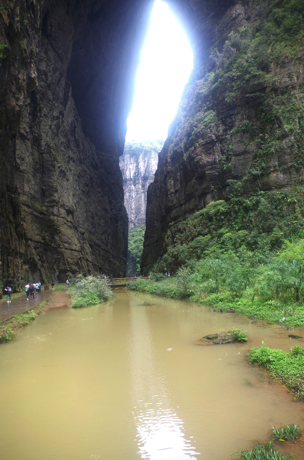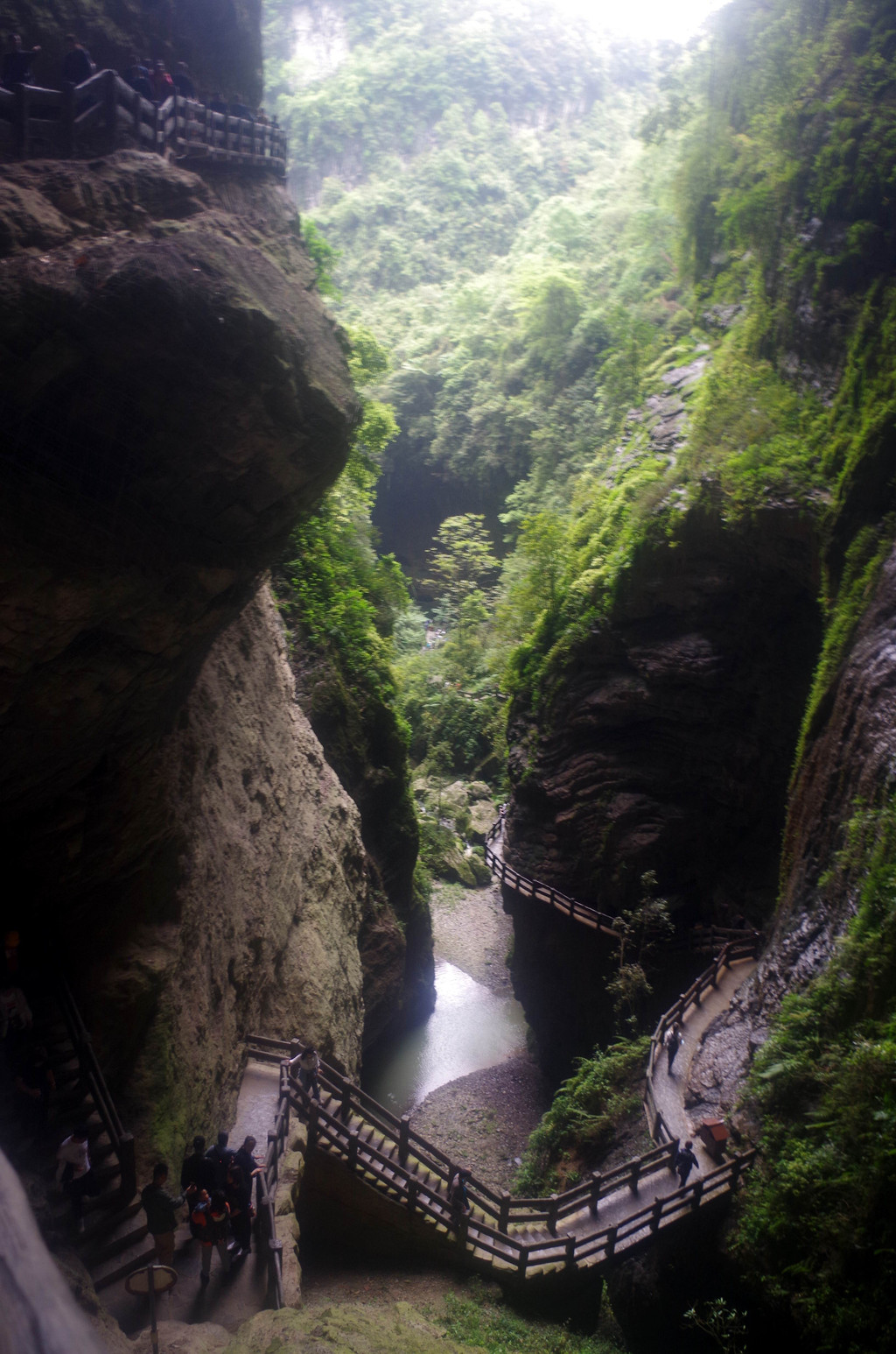 我们是由中部坐一架直升电梯下去到半腰的,然后曲折继续下行直至谷底,通行长度为3.5公里,缝深80到200米,底宽3到30米,缝两壁陡峭如刀切,是典型的“一线天”峡谷景观。