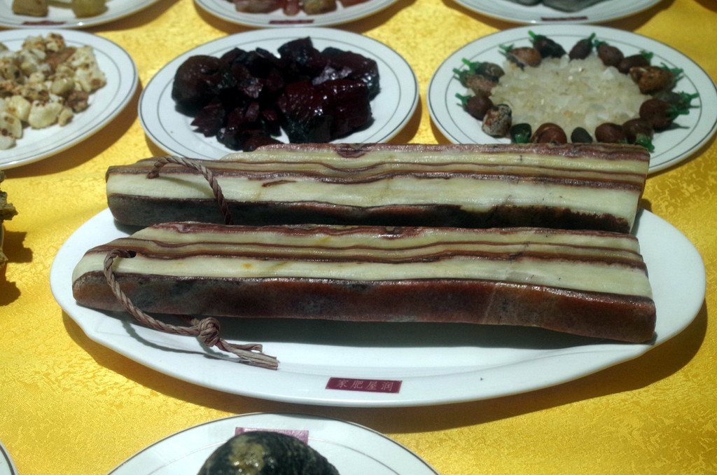 上图那两块长条猪肉形石头,导游说1200万都没卖。不过,我好像记起来,在宁夏张贤亮的西北影视城里,也见过这种肉形石。
