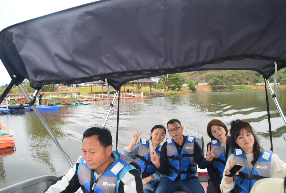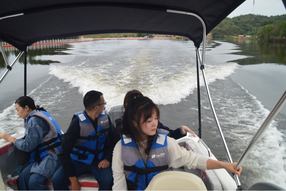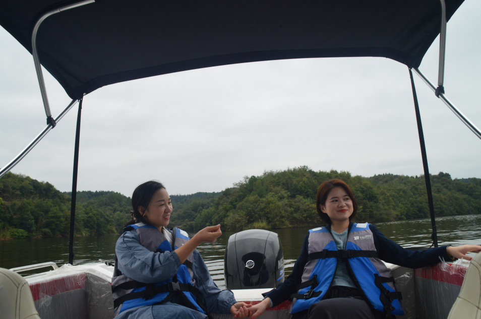 小憩片刻后,来到水上娱乐区,这里有皮划艇、快艇、竹筏游湖等项目可以体验,我们这群站在时代前沿的“弄潮儿”,自然而然要选择最有刺激体验感的快艇啦!伴着发动机的轰鸣声,快艇如同利刃般,划开庐山西海的面纱,带着我们去领略那迷人的湖光山色;帅气的船长偶尔在湖面来个漂移,更是让所有人尖叫声连连。也许这一声声呐喊声中,可以将平时的压力给释放出去吧,让我们忘情在这山水之间里。