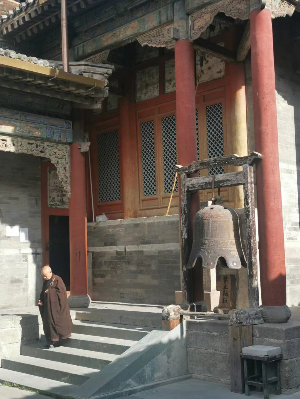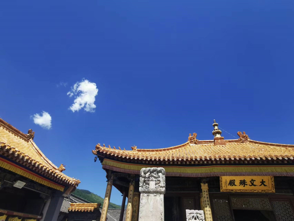 ※显通寺(推荐指数五颗星):五台山最古老的寺院,始建于东汉,与洛阳白马寺同为中国最早的寺庙之一,是五台山佛教文化的发源地。闹中取静,院外有绿树红墙蓝天白塔,院内有铜铸千钵文殊像、洁白的无量殿、blingbling的铜殿等等,恢弘的历史气息扑面而来。有意思的是,临近敲钟时间,不知道哪个游客手欠敲了一下,好几位僧人还没做好准备就匆忙从屋里赶出来,像极了上课要迟到的学生。