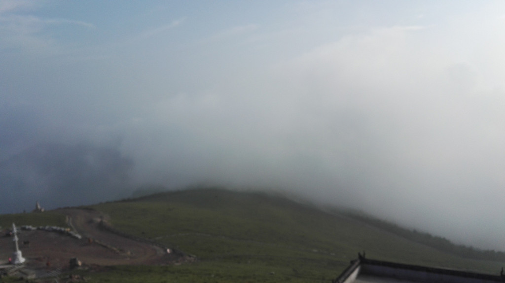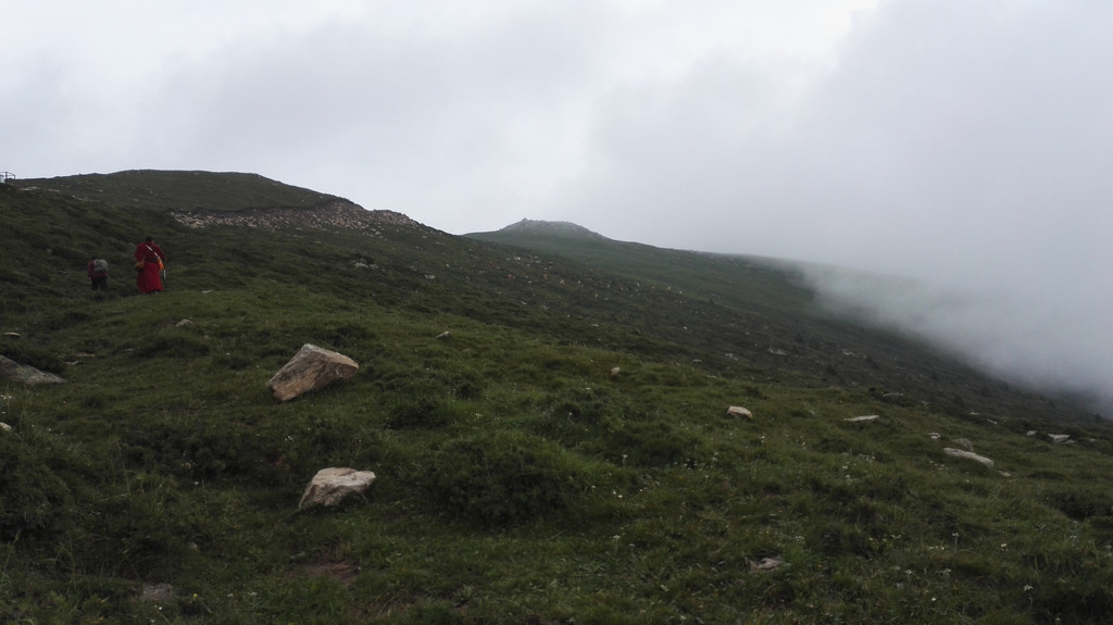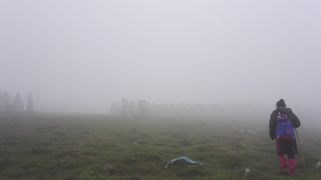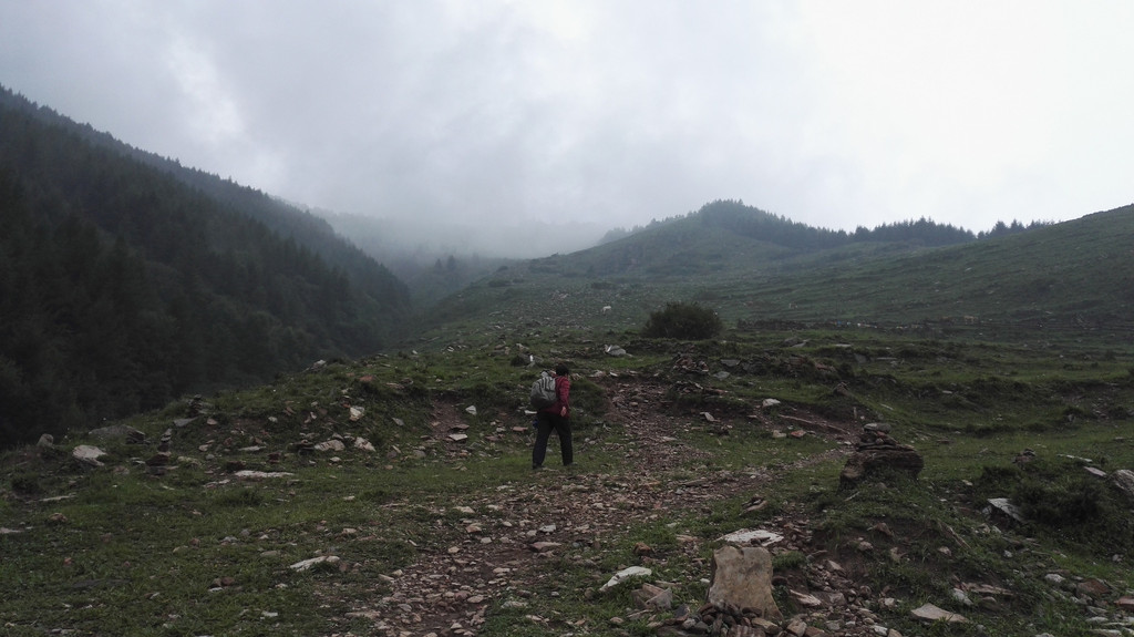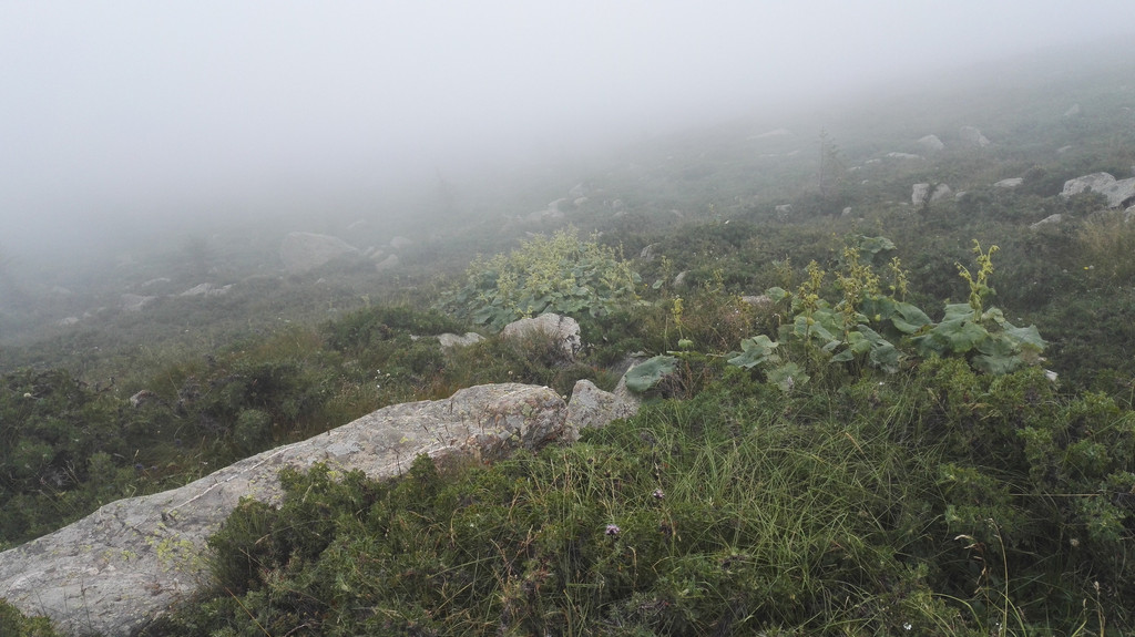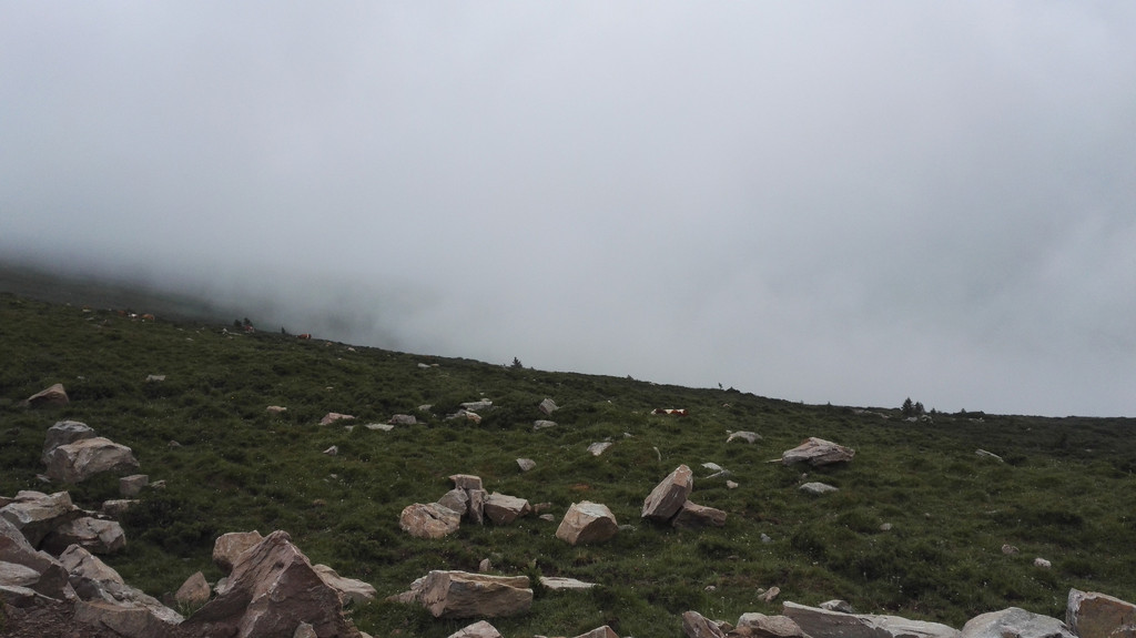 下午的天气没有上午那么赞,走了一段公路后开始变天了,大雾又来了,没有什么心情说笑 和拍照,我们行进的速度快了很多,但从来没能超过阿姨和师傅们,我们披霜拍雾的走着,脚下都是杂草和大石头,这是去西台的路,小叶说,西台和中台很近,只要到了西台,就离吃饭睡觉的中台不远了,此时由于赶路我有些饿了,我们的干粮所剩不多,边走边吃了点面包,话也没那么多了。