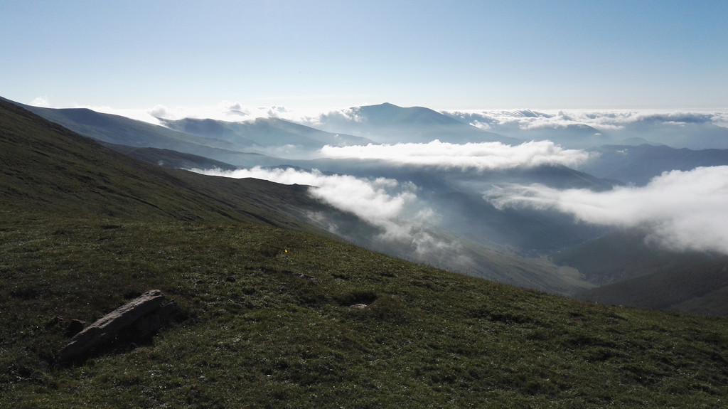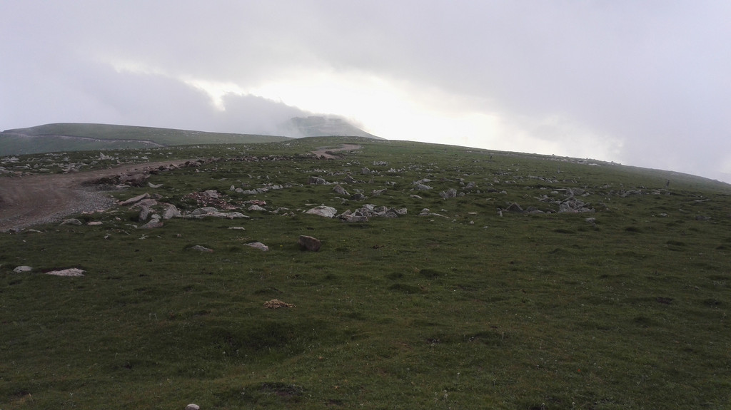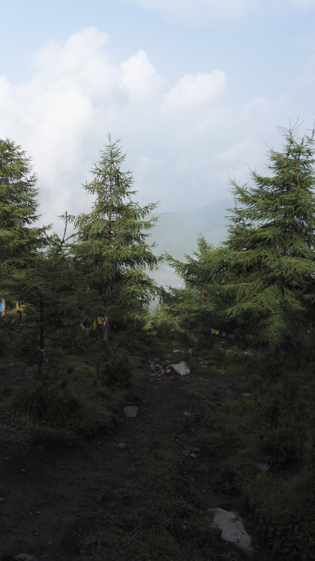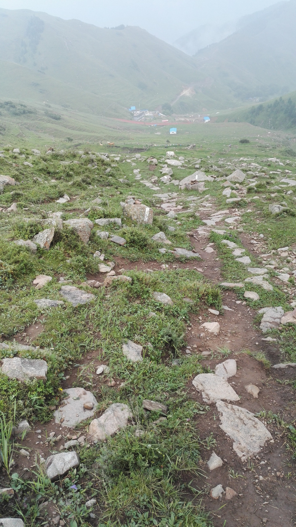 下午的天气没有上午那么赞,走了一段公路后开始变天了,大雾又来了,没有什么心情说笑 和拍照,我们行进的速度快了很多,但从来没能超过阿姨和师傅们,我们披霜拍雾的走着,脚下都是杂草和大石头,这是去西台的路,小叶说,西台和中台很近,只要到了西台,就离吃饭睡觉的中台不远了,此时由于赶路我有些饿了,我们的干粮所剩不多,边走边吃了点面包,话也没那么多了。