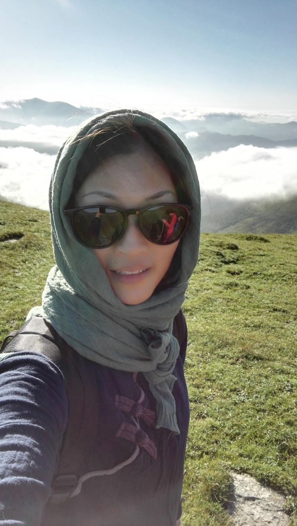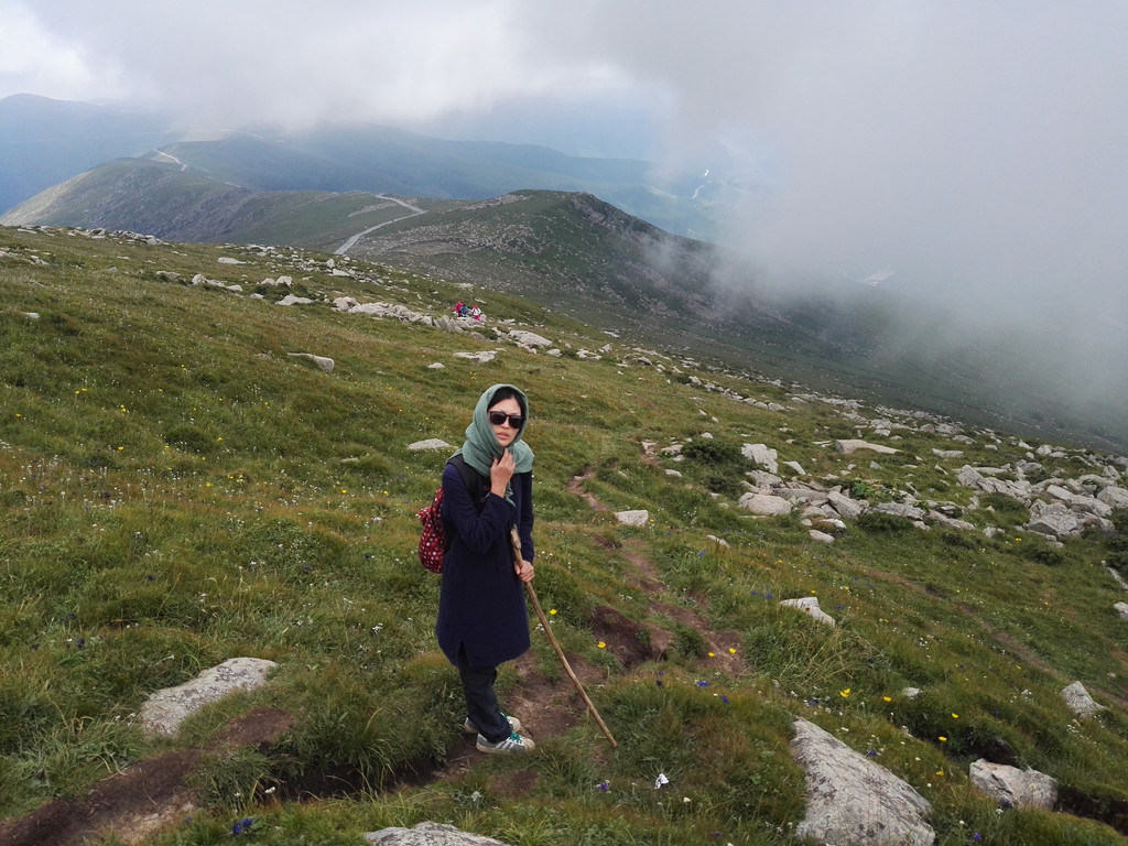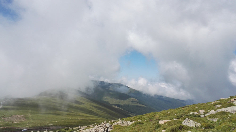 一路还是山,气势磅礴的,新奇秀丽的,绵延不断,云雾环绕着大山,配着蓝天和绿草,美不胜收。不禁要自拍一张,呵呵