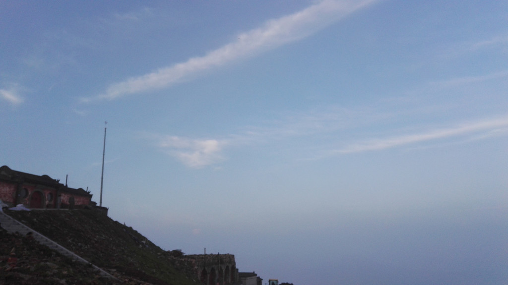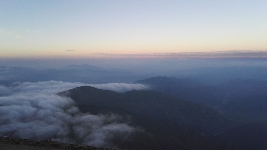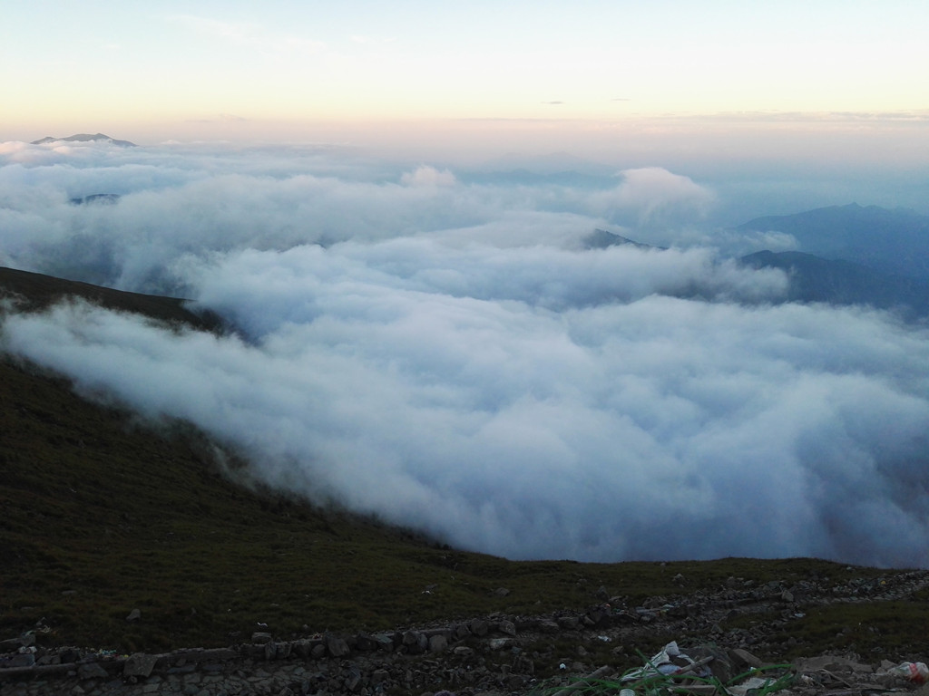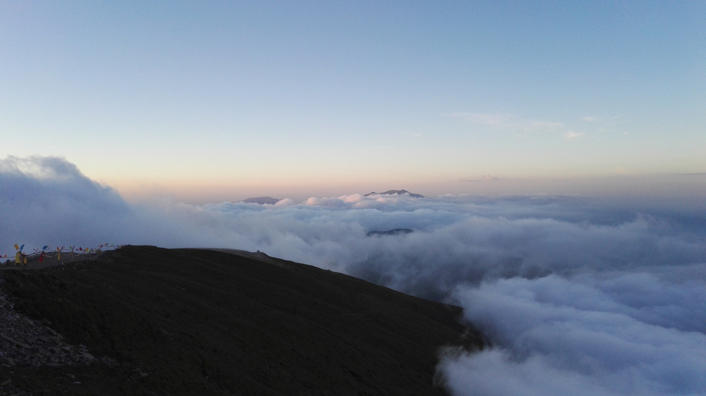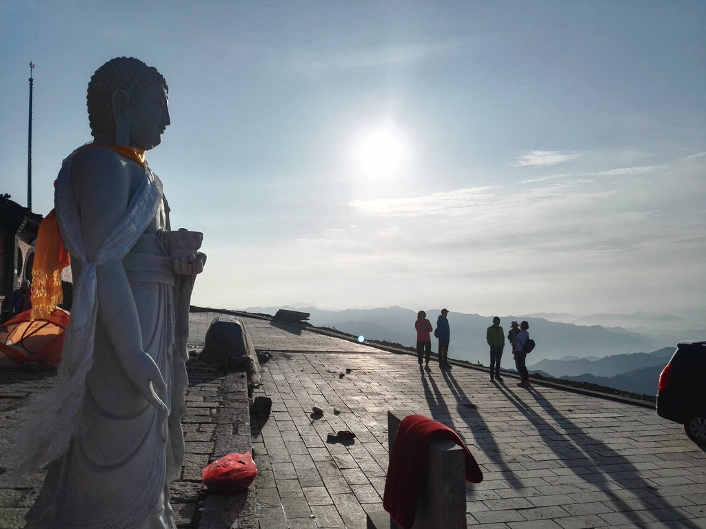 东台顶今天异常的热闹,挂单的人很多,太阳快要落山了,却还有很亮的光,壮观的云海就要出现了。