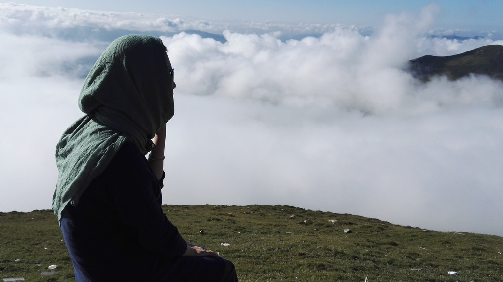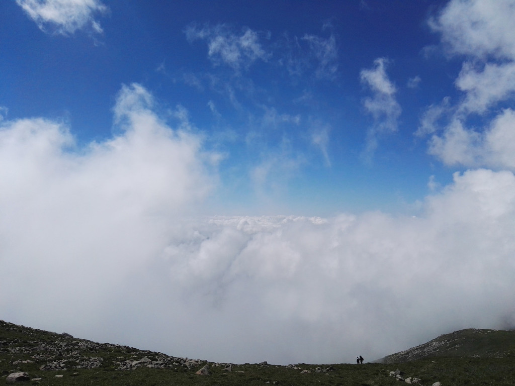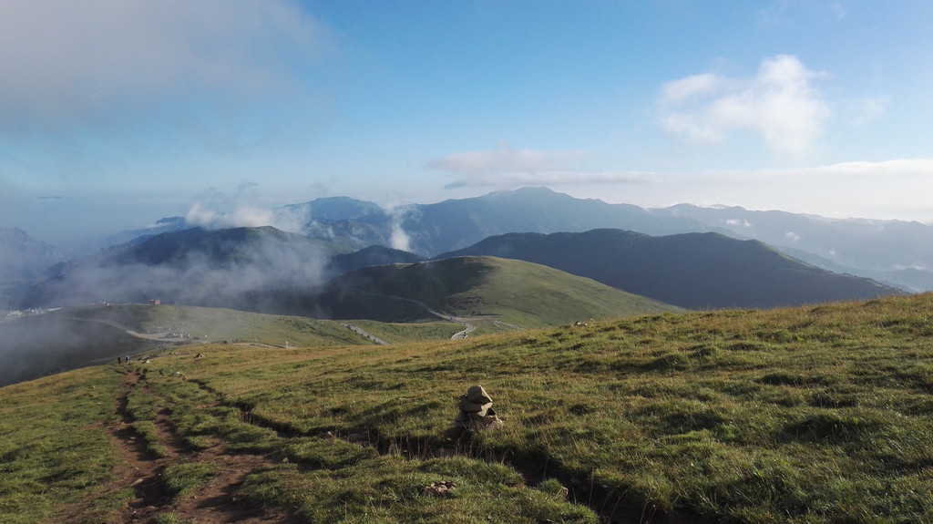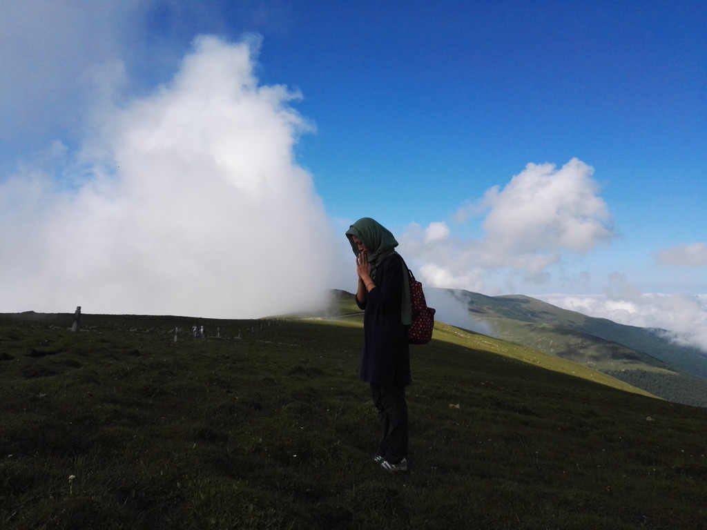 翻过这座圆圆的山就要到中台了,天气也有好转,阿姨和师傅们边休息边等我和小叶,终于没有了紧迫感,阿姨又在拜山。