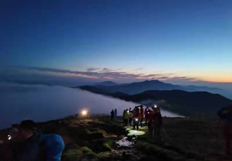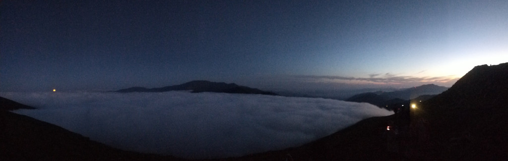 从鸿门岩至东台爬升约300米,里程约1.7公里,大家都穿着羽绒服或者加绒冲锋衣,背着10公斤左右的装备,带着头灯,一路攀升,路面会有前几天下雨的痕迹,偶遇泥泞,但不要紧,山石路为主,较陡