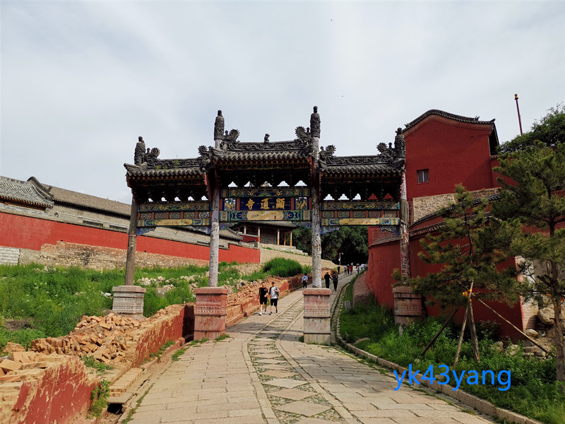 登上108级台阶,来到山门前。台上立着一座康熙53年所立的四柱三门七出檐的木牌楼。牌楼造型精致,龙凤彩绘,可称是五台山最美丽的木牌楼。牌楼额题“灵峰胜境”,是康熙皇帝的御笔。
