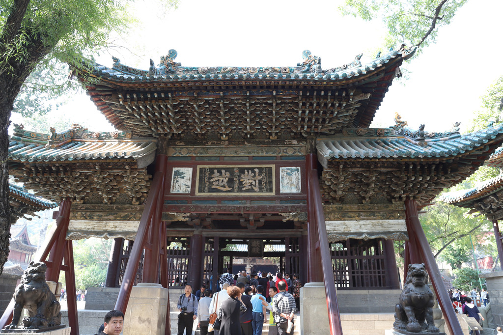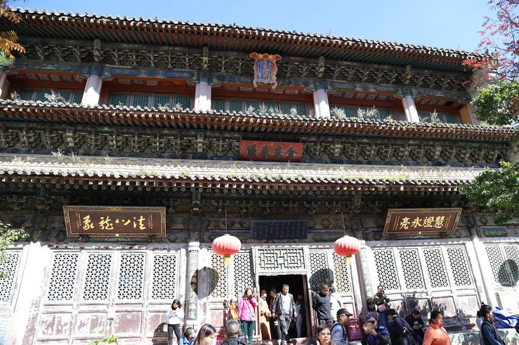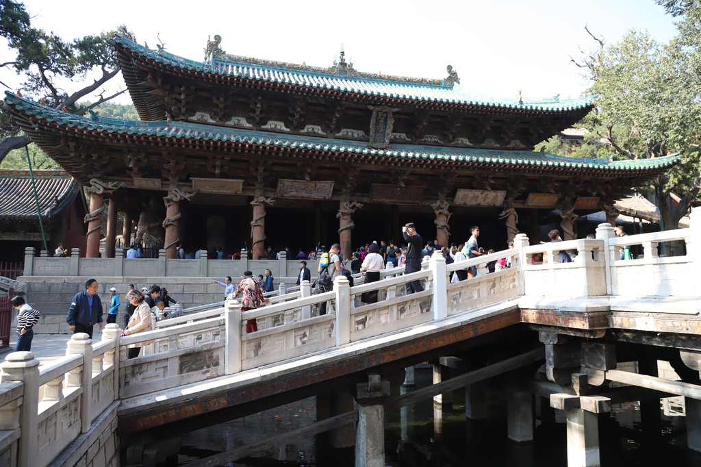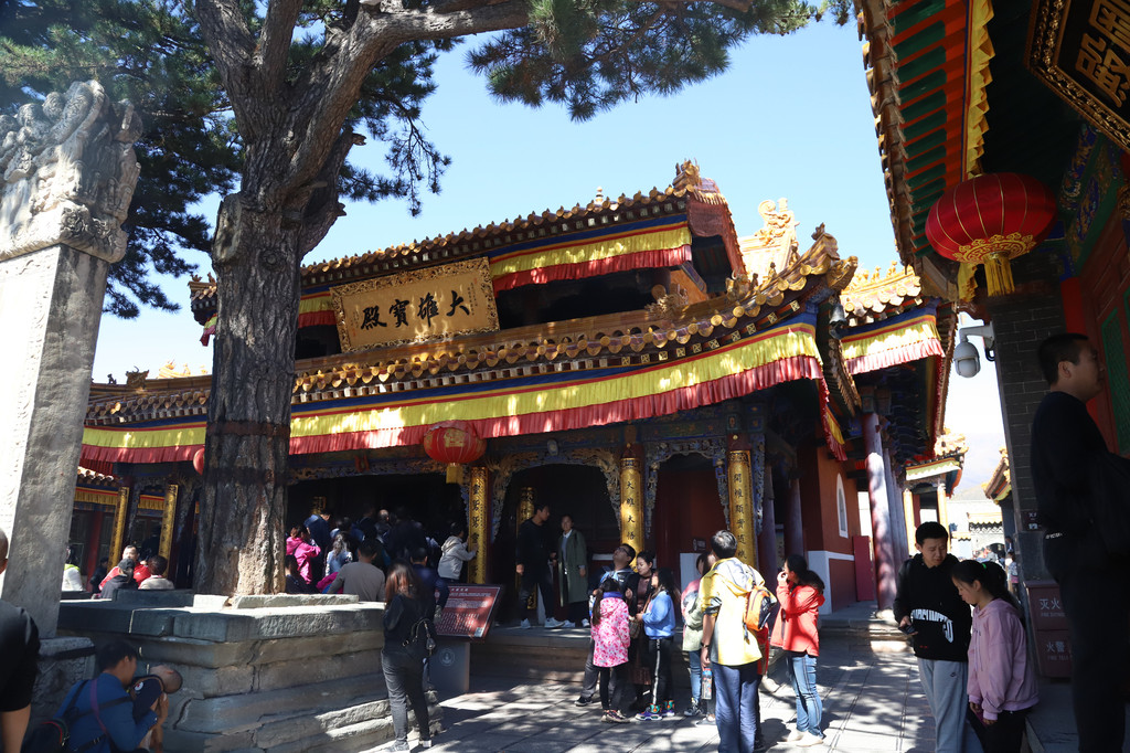 从菩萨顶下来,南边就是显通寺,据说显通寺是中国历史上第二座寺院,建成仅晚于洛阳白马寺,当年汉明帝请来印度僧人摄摩腾和竺法兰,在京都洛阳建白马寺,后两人来到五台山建造了显通寺,揭开了五台佛国的历史。显通寺在五台山寺庙群中规模最大(占地120亩)、历史最悠久,俗称“祖寺”,也是历朝历代的皇家寺院,现存建筑大多为明、清时期的建筑。在全寺中轴线上七重殿宇分为观音殿、文殊殿、大佛殿、无量殿、千钵殿、铜殿和藏经殿,各具特色,无一雷同。游览显通寺有三大看点:全木结构的大佛殿、全铜铸成的铜殿、纯砖结构的无量殿。