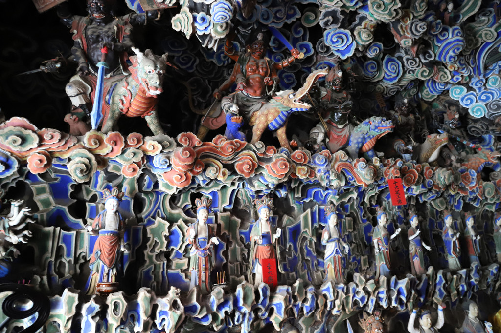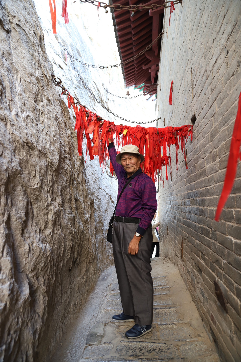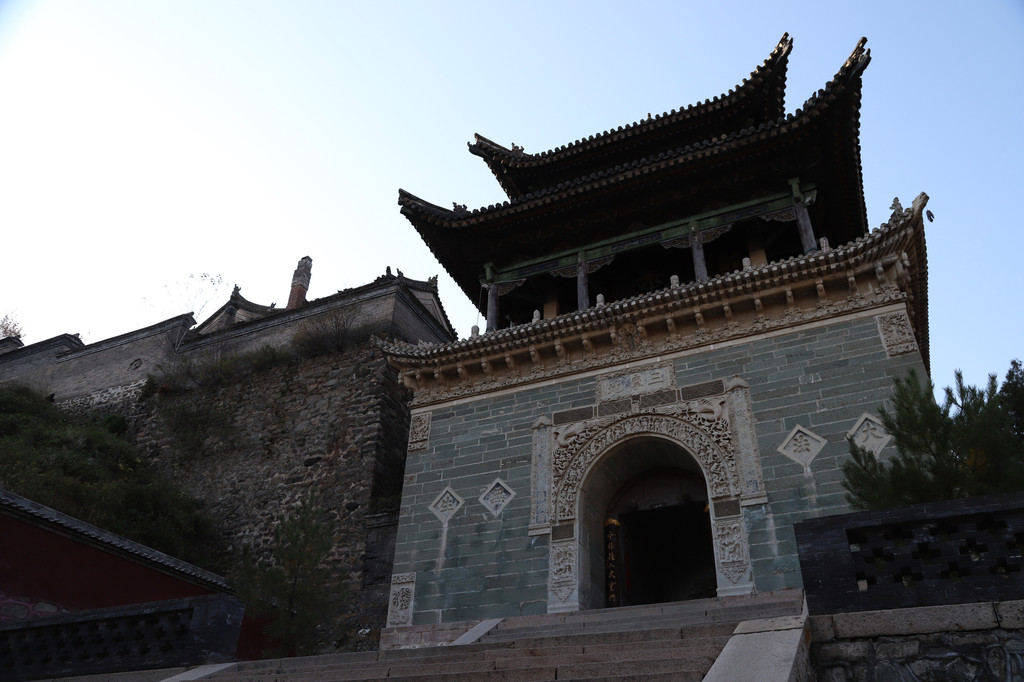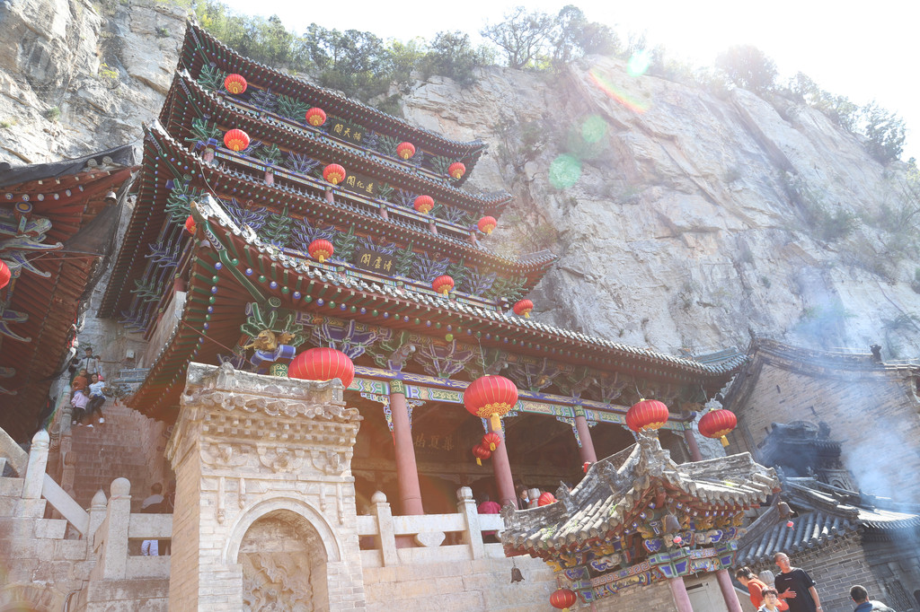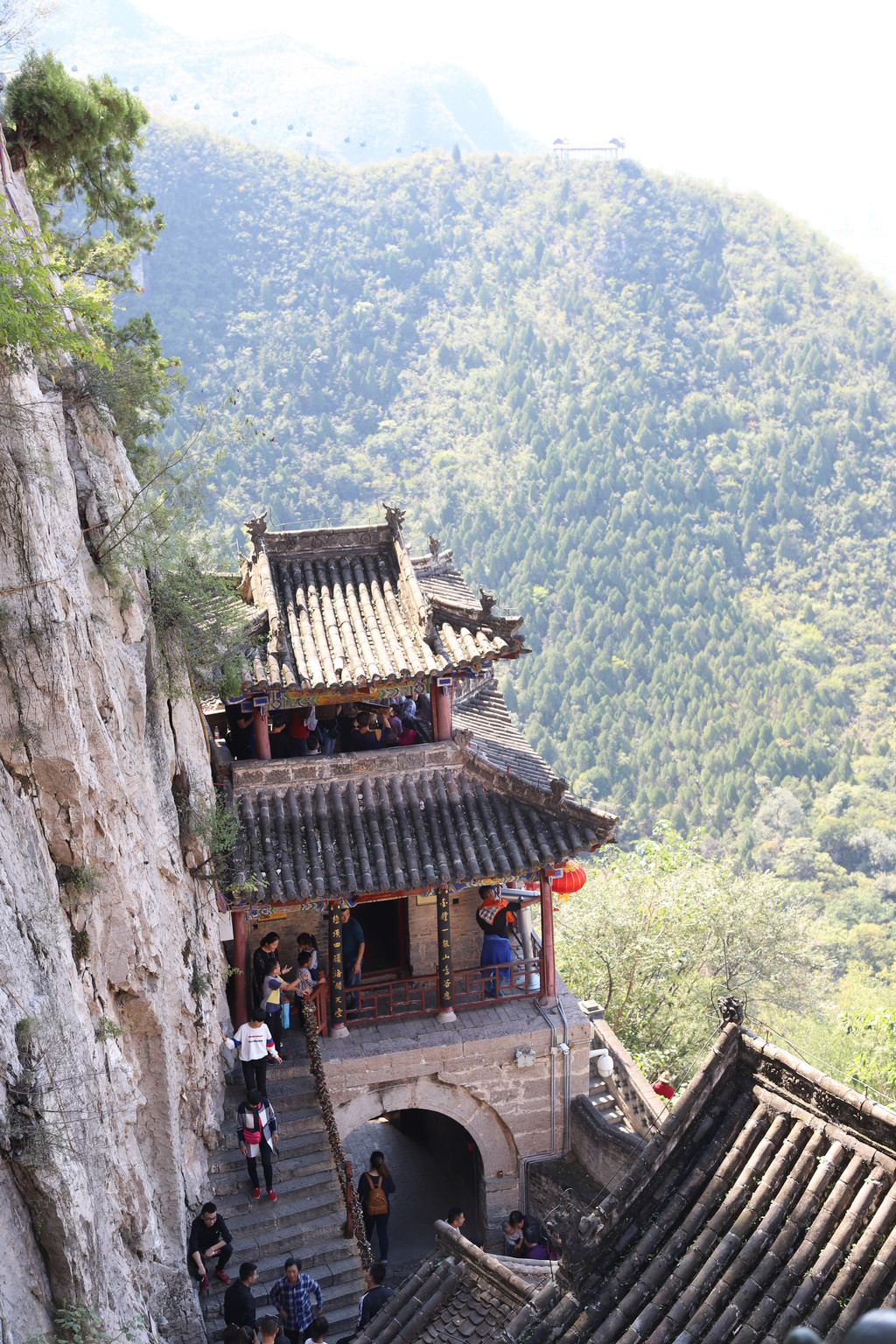 在山腰处便是悬空而建的娲皇宫主殿,三层都供奉了女娲娘娘,旁边的殿堂里还有北齐时期的石窟、石刻经文的遗迹。山腰区域的视野非常开阔,只是没什么好看的。娲皇宫主殿后面有九根铁索连着,不知道起不起作用。