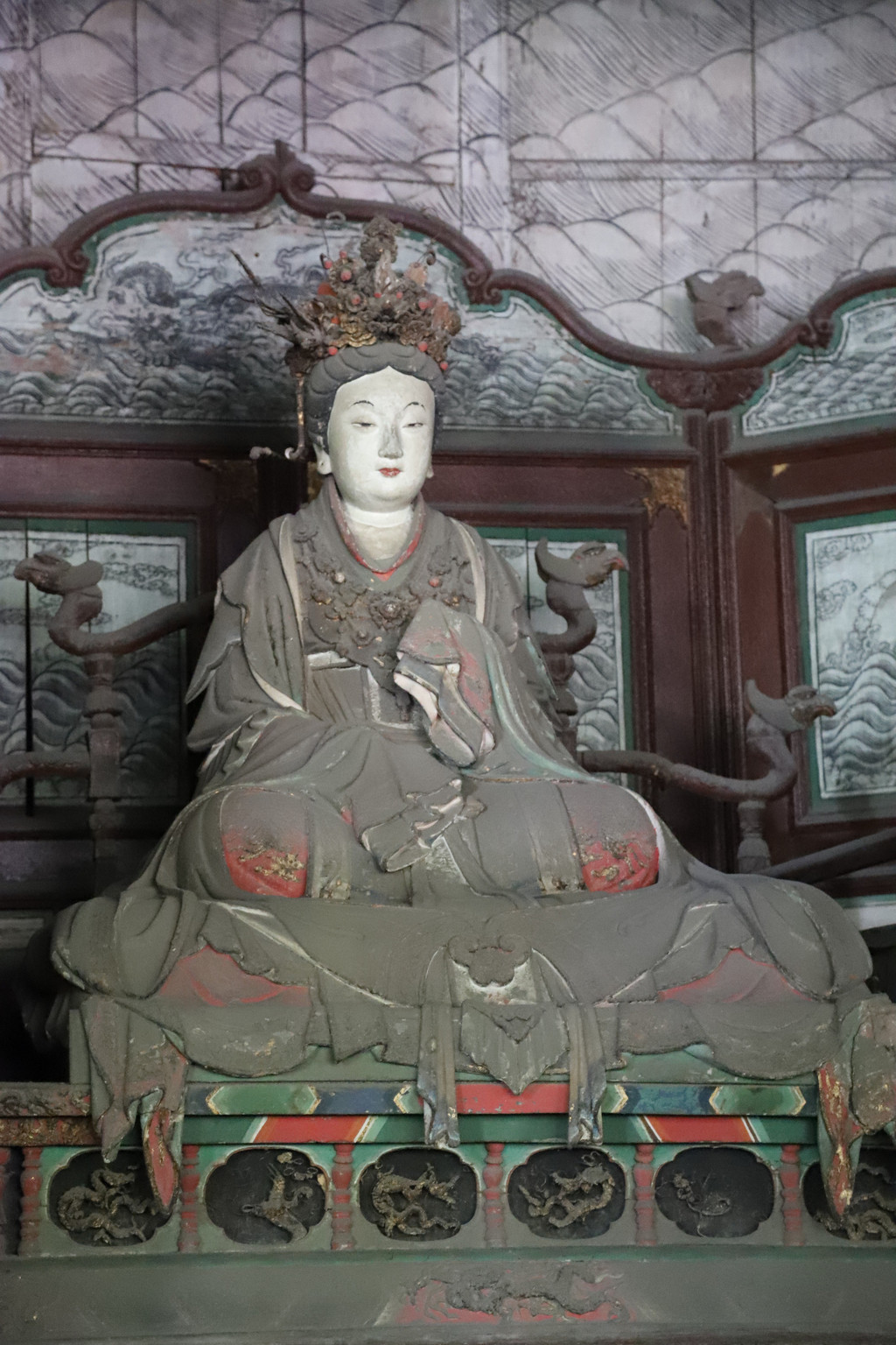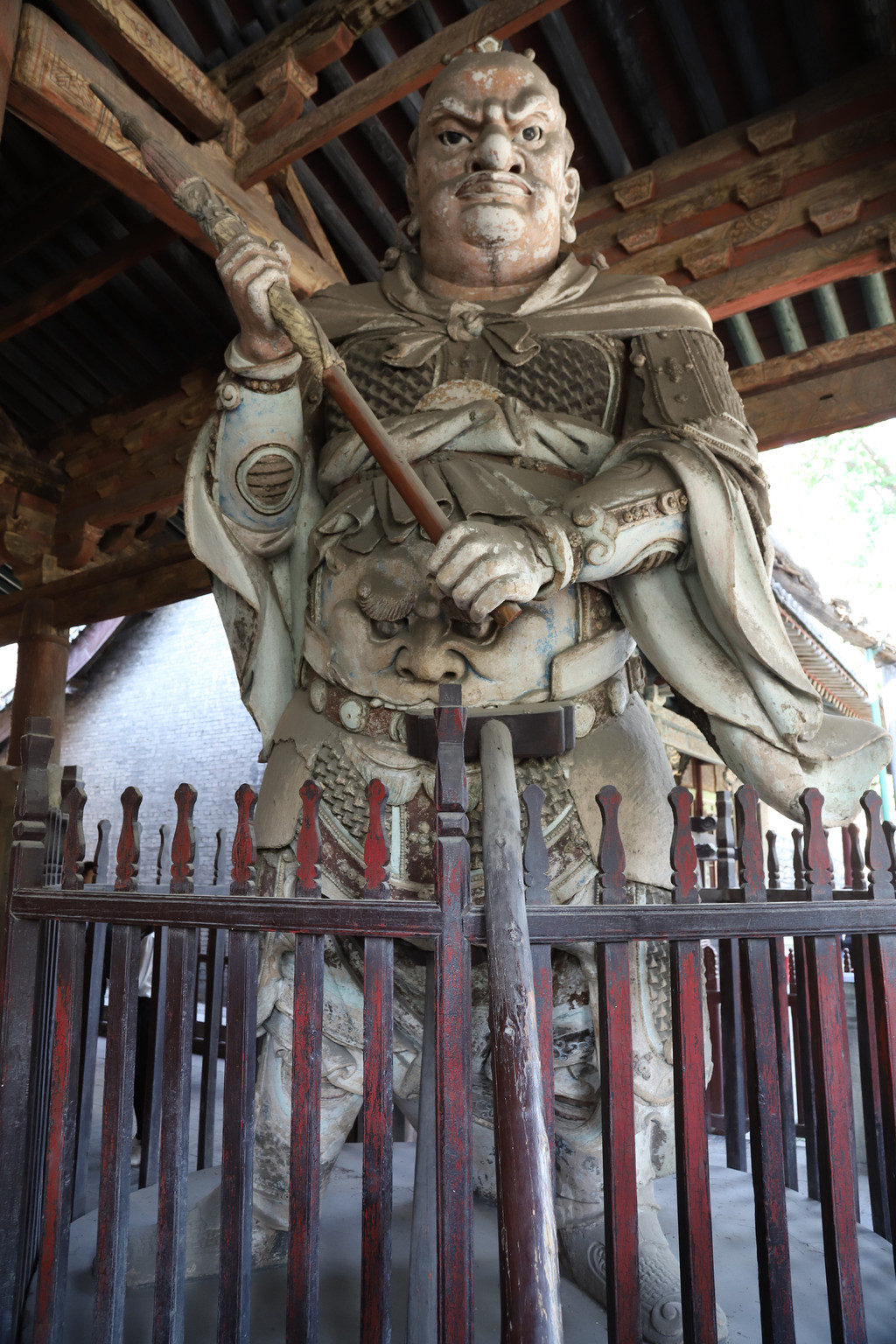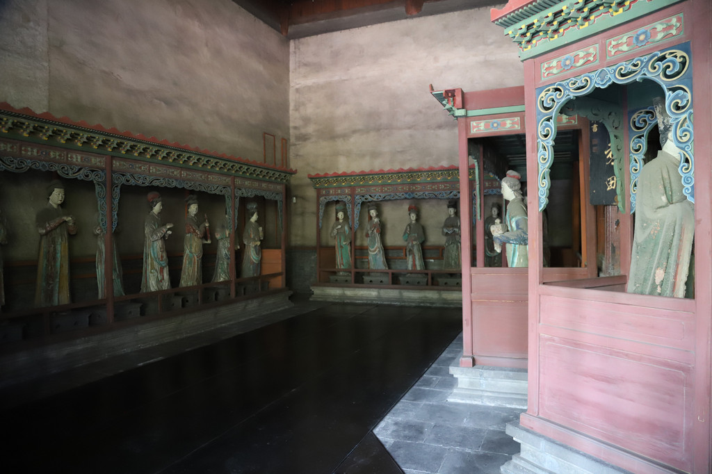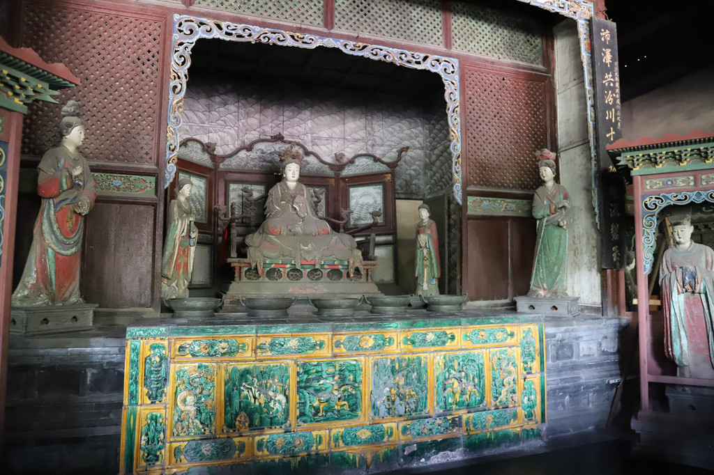 圣母殿创建于宋天圣年间(1023年—1032年)原名“女郎祠”。圣母传为叔虞之母邑姜,殿内存有宋代精美彩塑侍女像41尊、明代补塑2尊。邑姜居中而座,神态庄严,雍容华贵。除圣母像两侧的小像是后来增补的,其余都是宋代原塑。侍从各有专职,表情无一雷同。