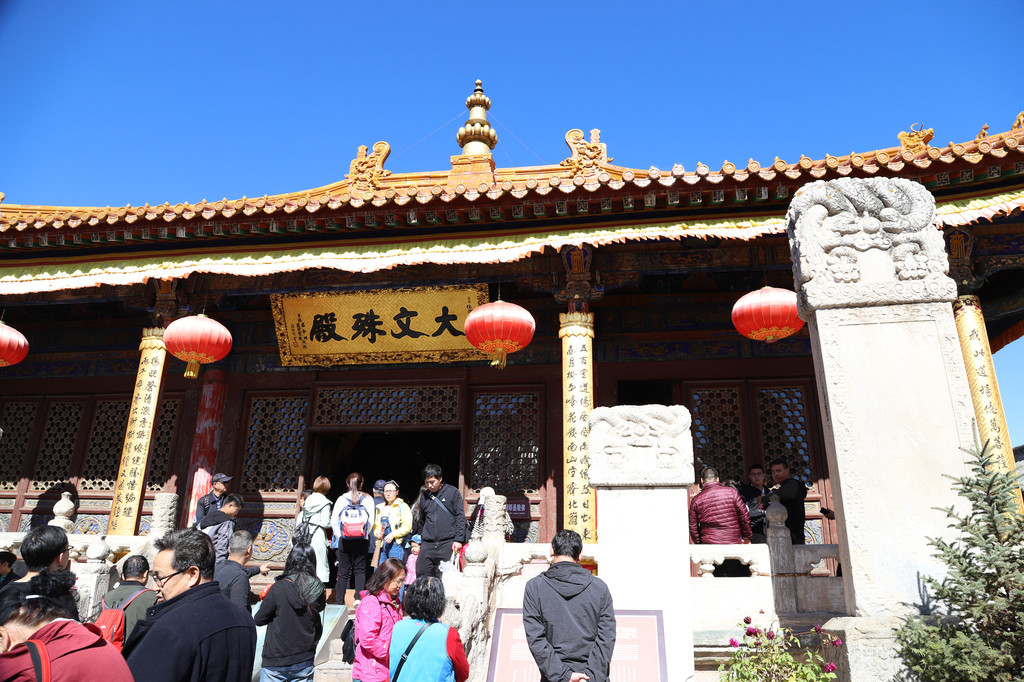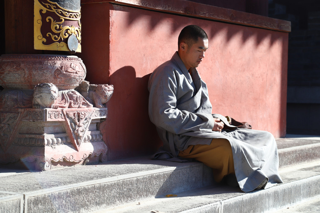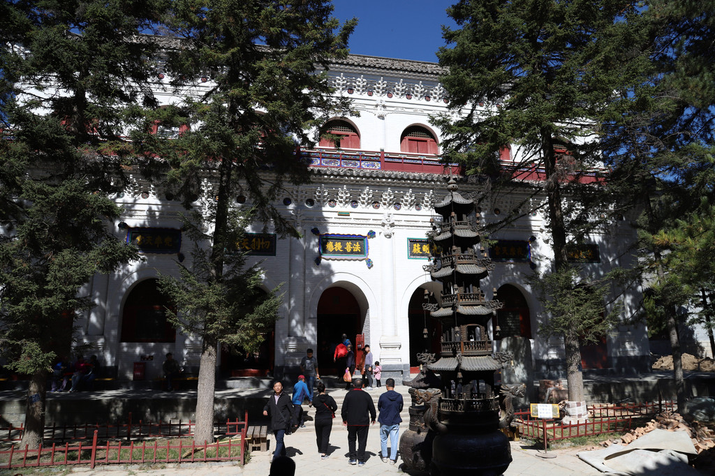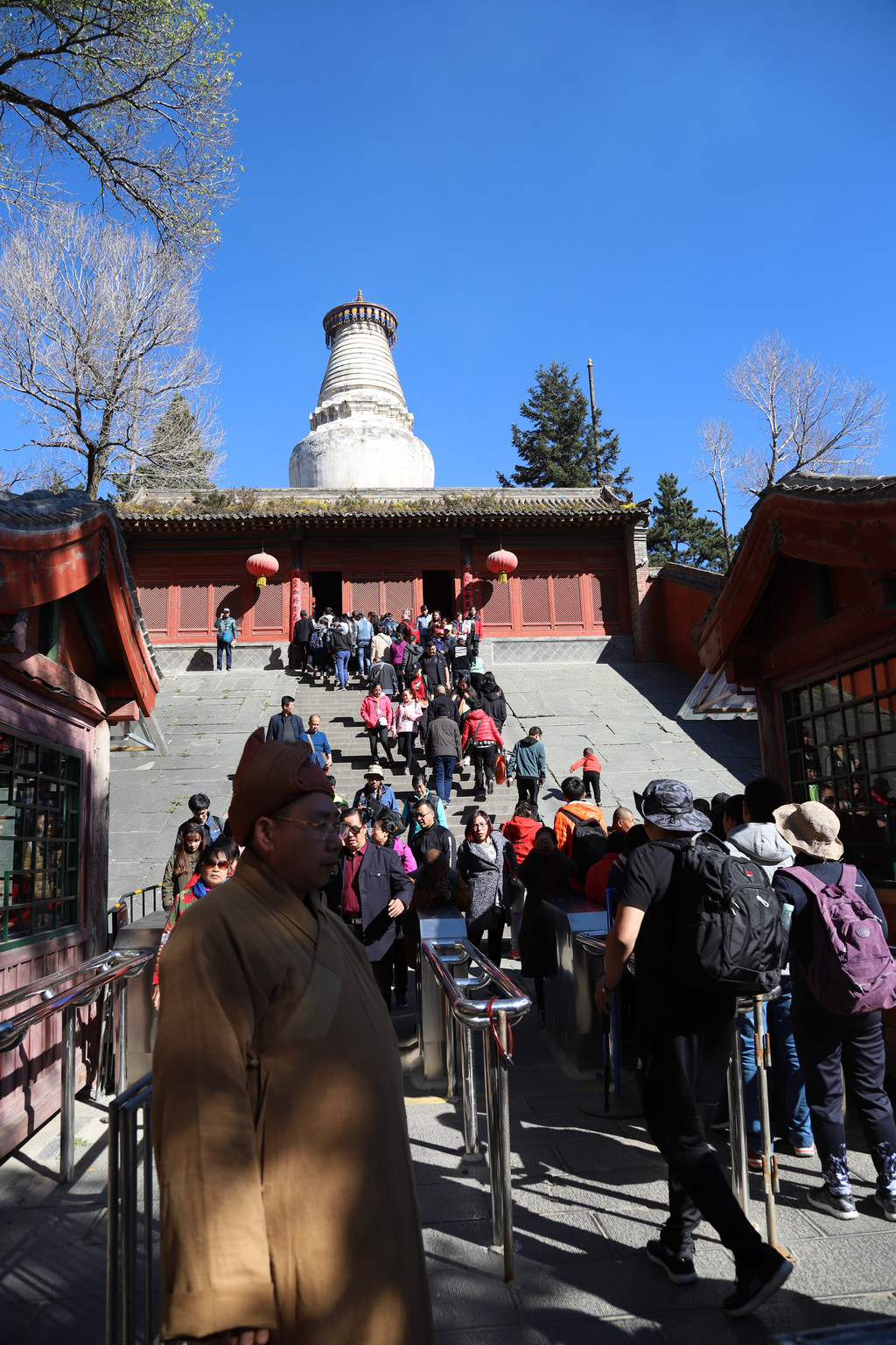 节日里自驾游人太多,景区内的公交停了。步行3公里来到中心寺庙区。沿着殊像寺、五爷庙、塔院寺顺路参观。殊像寺门口的僧人。