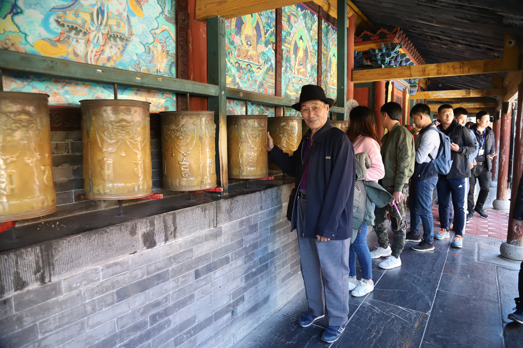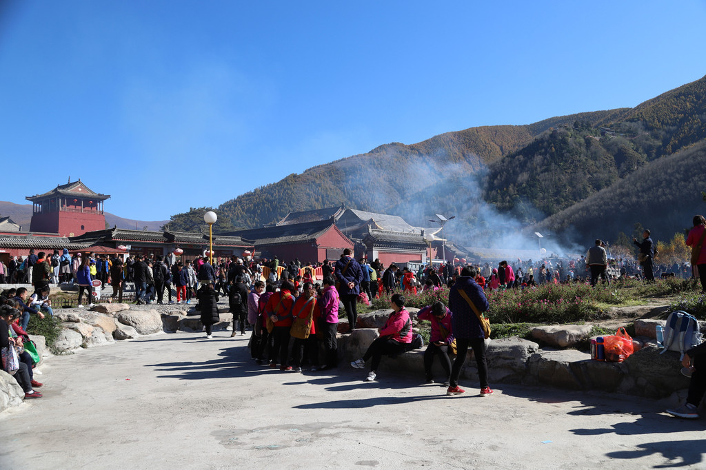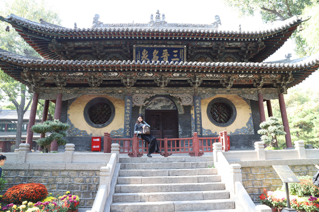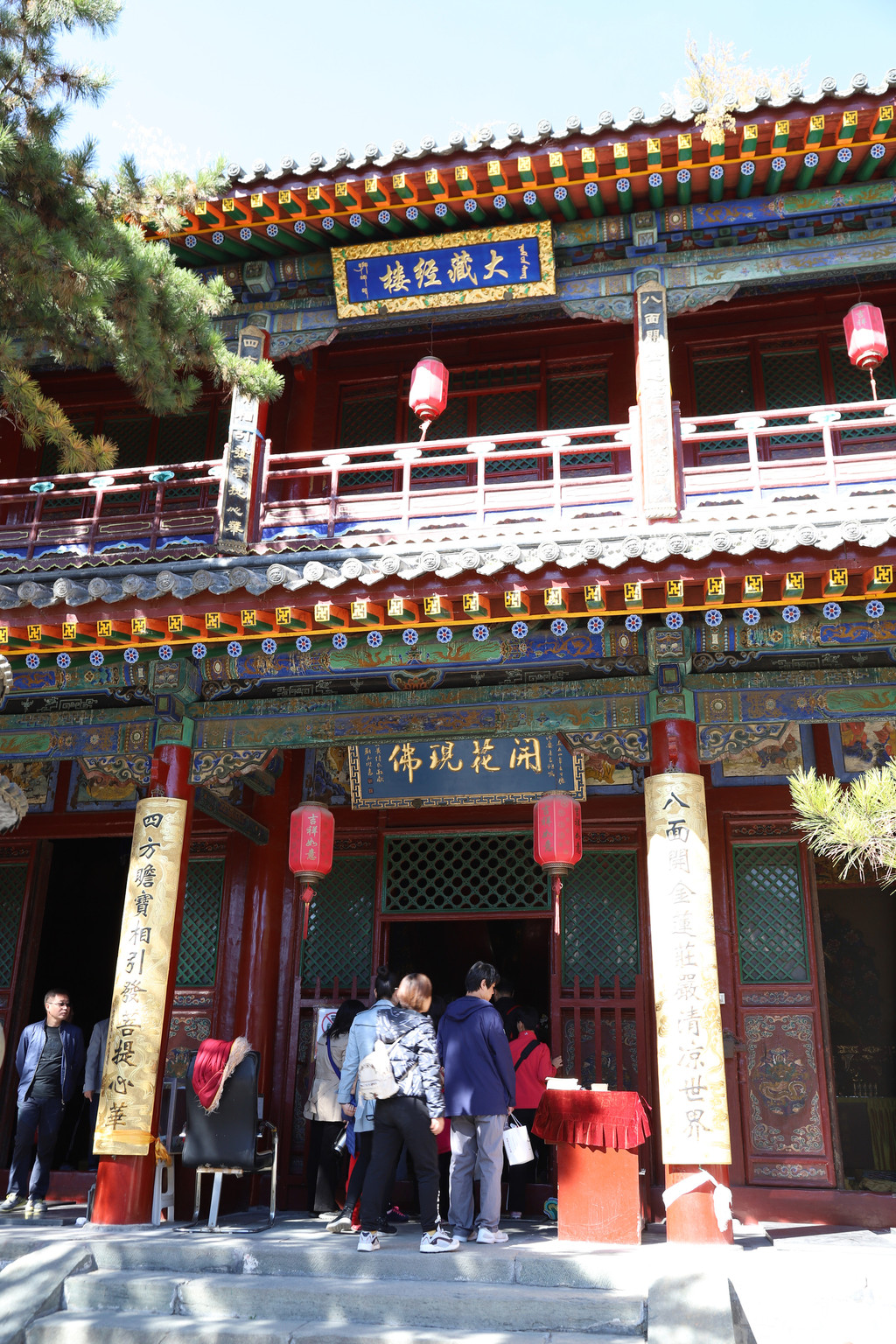 节日里自驾游人太多,景区内的公交停了。步行3公里来到中心寺庙区。沿着殊像寺、五爷庙、塔院寺顺路参观。殊像寺门口的僧人。