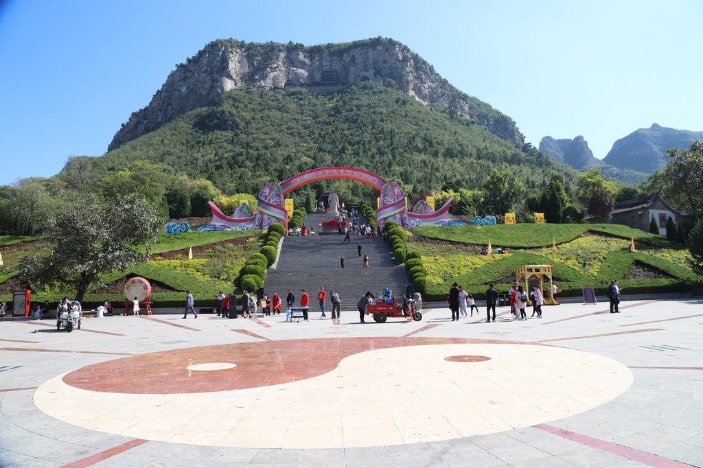 9点离开丛台,2小时开了100公里来到邯郸涉县的娲皇宫,娲皇宫始建于南北朝北齐年间,是在太行山东麓的唐王山山腰上悬空而建,经过历代修葺扩大的建筑群,现在是国内最早、规模最大的祭祀女娲的古建筑群。如今的娲皇宫主要是明清建筑,不过还有北齐年间的摩崖刻经。娲皇宫景区的面积很大,从入园口到山下有两公里,没什么看的,就是为了收电车费吗?山下建筑有山门牌坊、朝元宫、补天广场等,没有游览山下的建筑群,在补天广场上和女娲娘娘的雕像拍照后,直接步行登山参观山腰处的建筑。