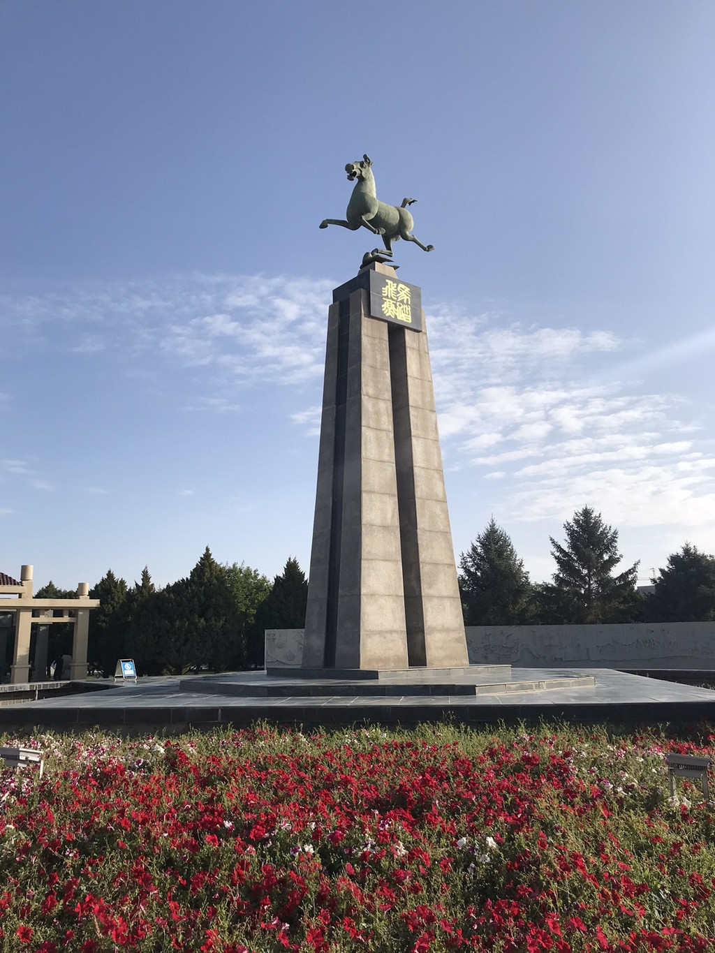 进门的大广场上,“马踏飞燕”的大型雕塑,矗立在高高的花岗岩座顶。