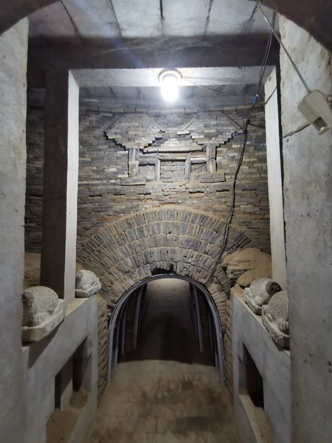 墓门及墓室的墙壁上,均以青砖和涂黑的色砖拼出各种菱形图案。墓道高约1.3—1.5米,参观者需低头弯腰,才可通过。