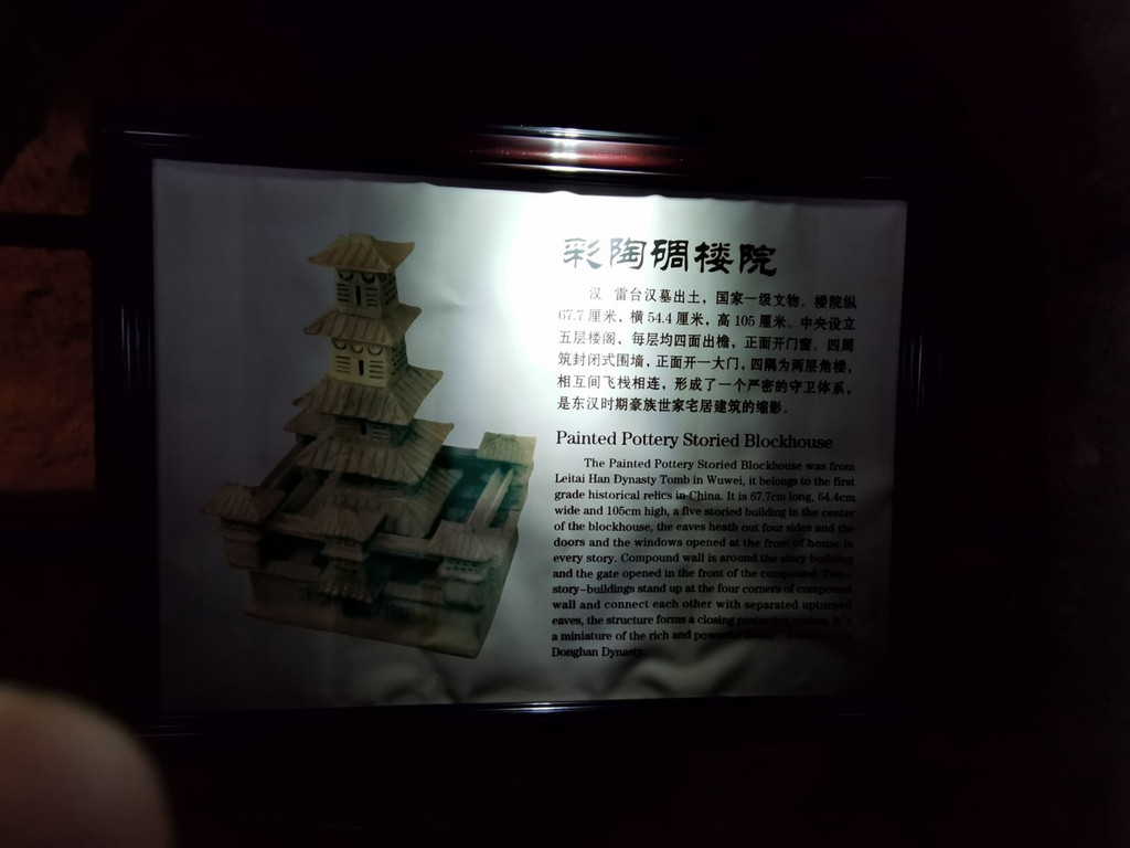 通道两边墙壁上,挂着汉墓出土的部分精美文物的图片,比如这幅彩陶碉楼院,国家一级文物,纵67.7厘米,横54.4厘米,高105厘米;中央竖有五层出檐楼阁,四周是封闭式围墙,四角设有相互连接的角楼,俨然一座严密的防守体系,应是东汉时期河西豪族世家的家居建筑的缩影。
