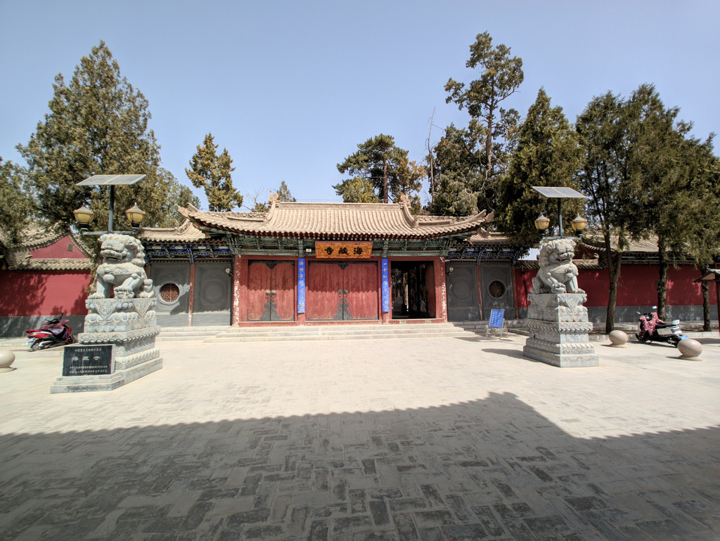 海藏寺占地面积13460平方米,现存院落以“中轴”为中心,由南向北,纵向排布多重院落空间。中轴线始于牌楼,依次布置山门、大雄宝殿、三圣殿、地藏殿、天王殿、藏经阁,两侧配置东西配殿、厢房等辅助建筑。