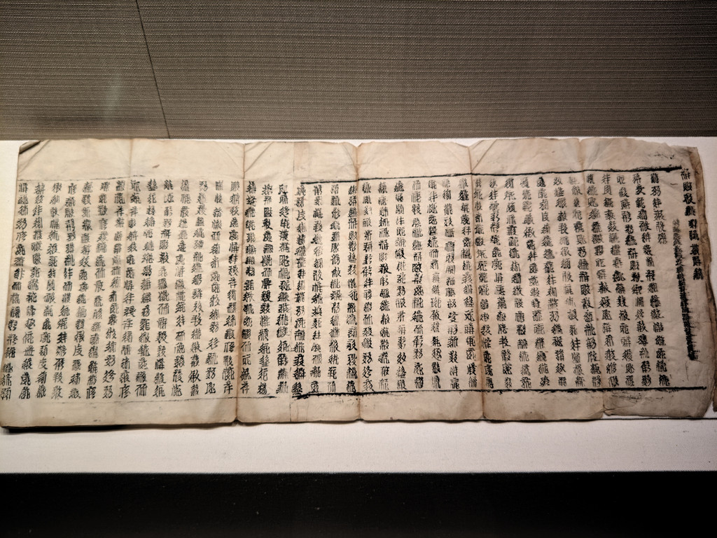 维摩诘所说经卷下卷,武威新华乡缠山村亥母洞出土,西夏文献文书,土黄色夹丝棉纸,折叠装,呈长方形,每页7竖行,每行17字,单页共53页,另半页。边缘残,局部缺,经文有首无尾,首题西夏文“维摩诘所说经卷下卷”。字迹墨色不均,线条粗细不匀,行、列排列不齐,为泥活字印本。