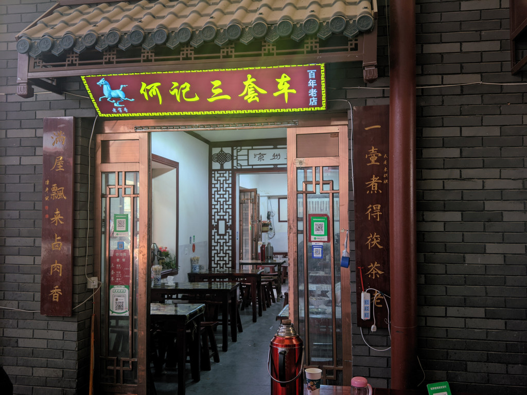 鸠摩罗什寺旁边有北关市场,其实不是真市场,是个小吃区。傍晚开的店不多,最出名的就是何记。