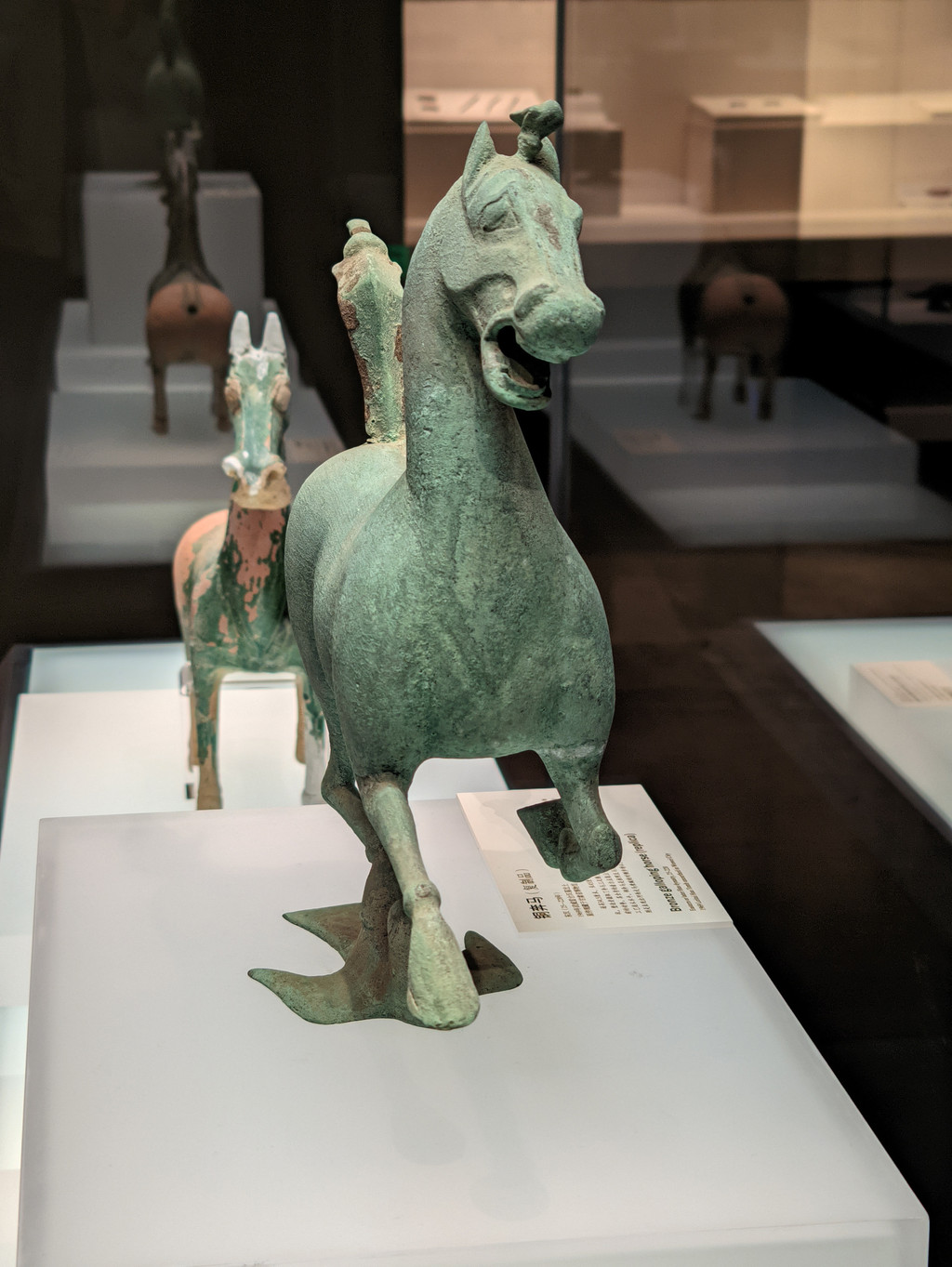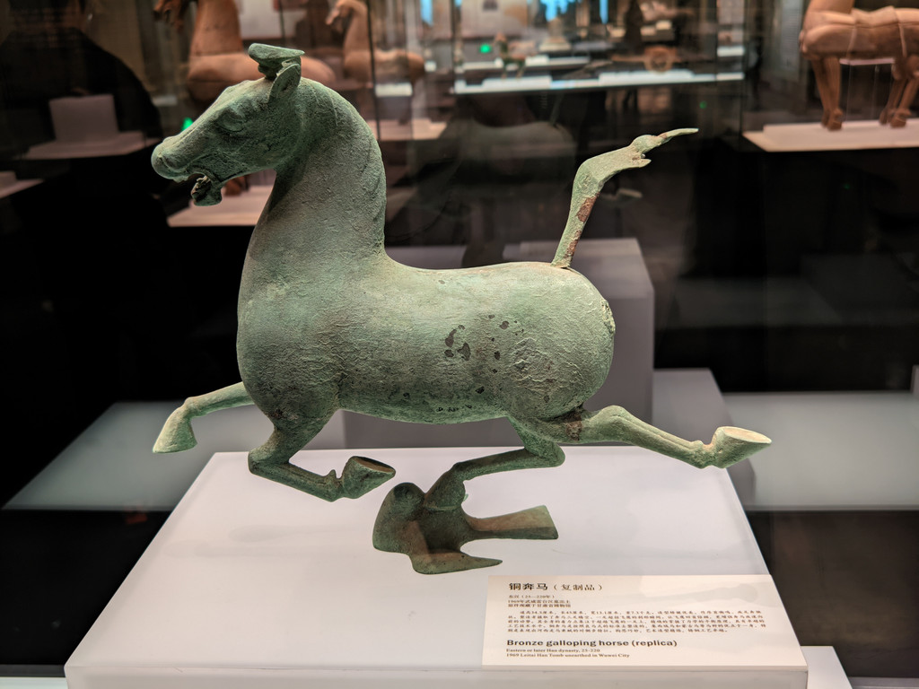 至于最吸引眼球的“马踏飞燕”,还是复制品。主打一个到处都是马踏飞燕,但罕见真品。真品只有在旺季的时候,才会在甘肃博物馆展出。国家认可的复制品也只有三件,分别在国家博物馆,甘肃博物馆和武威博物馆。