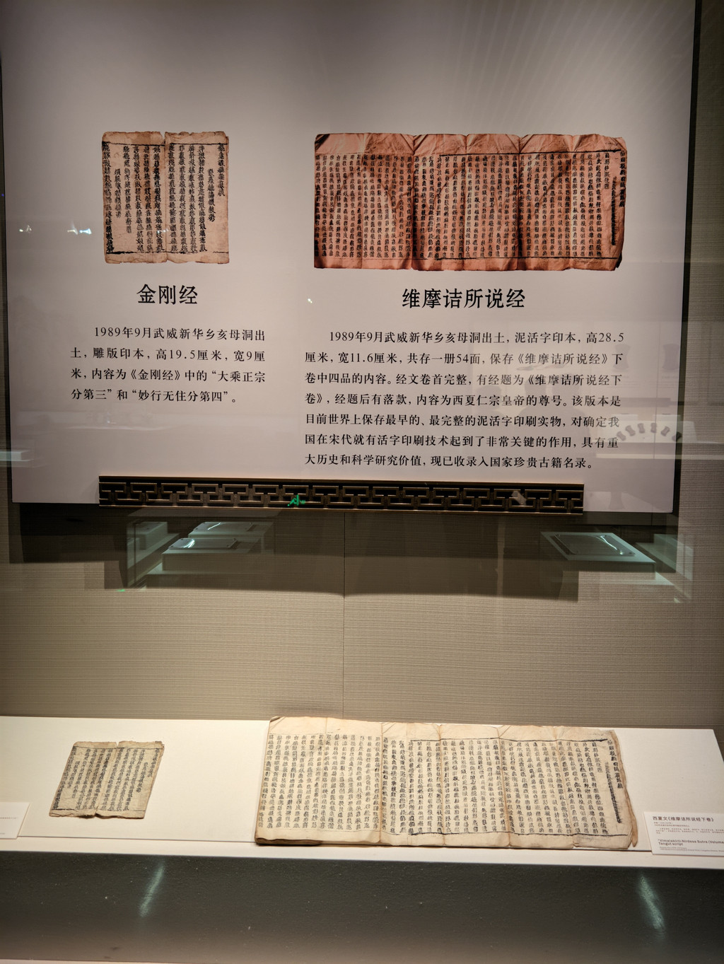 博物馆内还收藏了众多武威出土的西夏文物,以西夏历史的顺序,生动再现了数百年的历史变迁。其他重要展品包括国宝木缘塔、西夏泥活字版经文和西夏木板画等,每一件都是历史的见证,但现在陈列的以复制品为主,真品在武威博物馆。