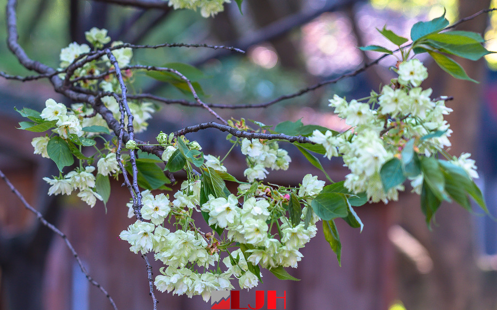 郁金樱开花的时间,跟其它樱花没有多大区别,花期也只有短短的七八天。因为郁金樱是重瓣花朵,跟那些单瓣的樱花来比,花朵的分量比较重,能把细长的树枝压弯。所以郁金樱开花时,总是像耷拉个脑袋,显得没精打采。但对喜欢拍照的来说,垂下来的樱花枝条,正好用来做前景。