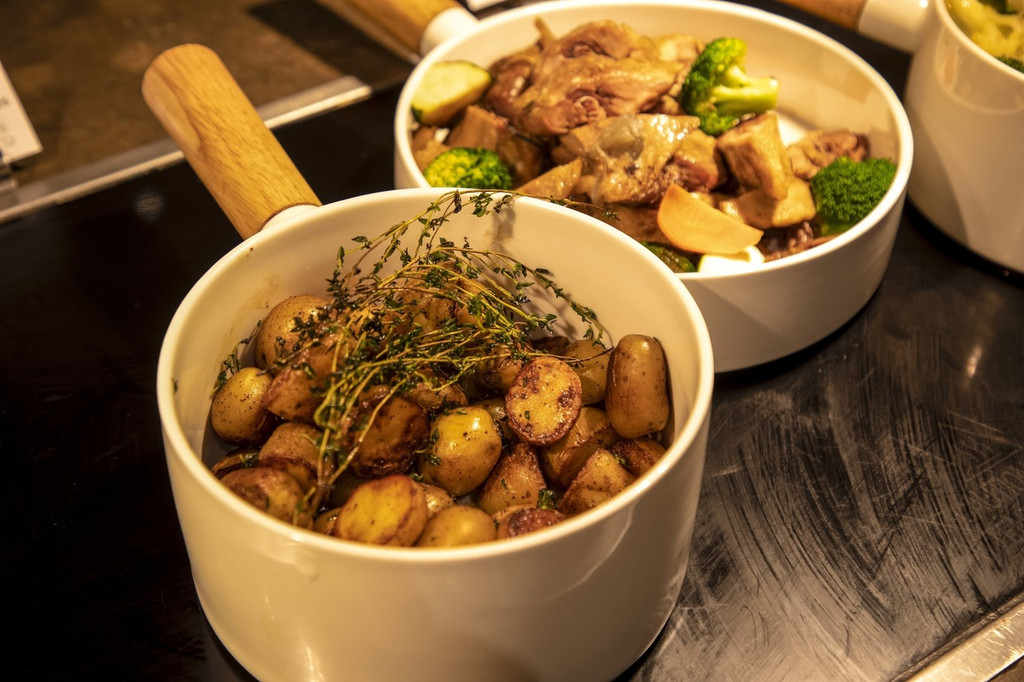 晚餐的种类很丰富,水里游的海鲜水产,岸上跑的鸡鸭羊肉,还有埋在土里的土豆蔬菜样样俱全。法式油封鸭腿、香草烤土豆等菜品样样俱全。